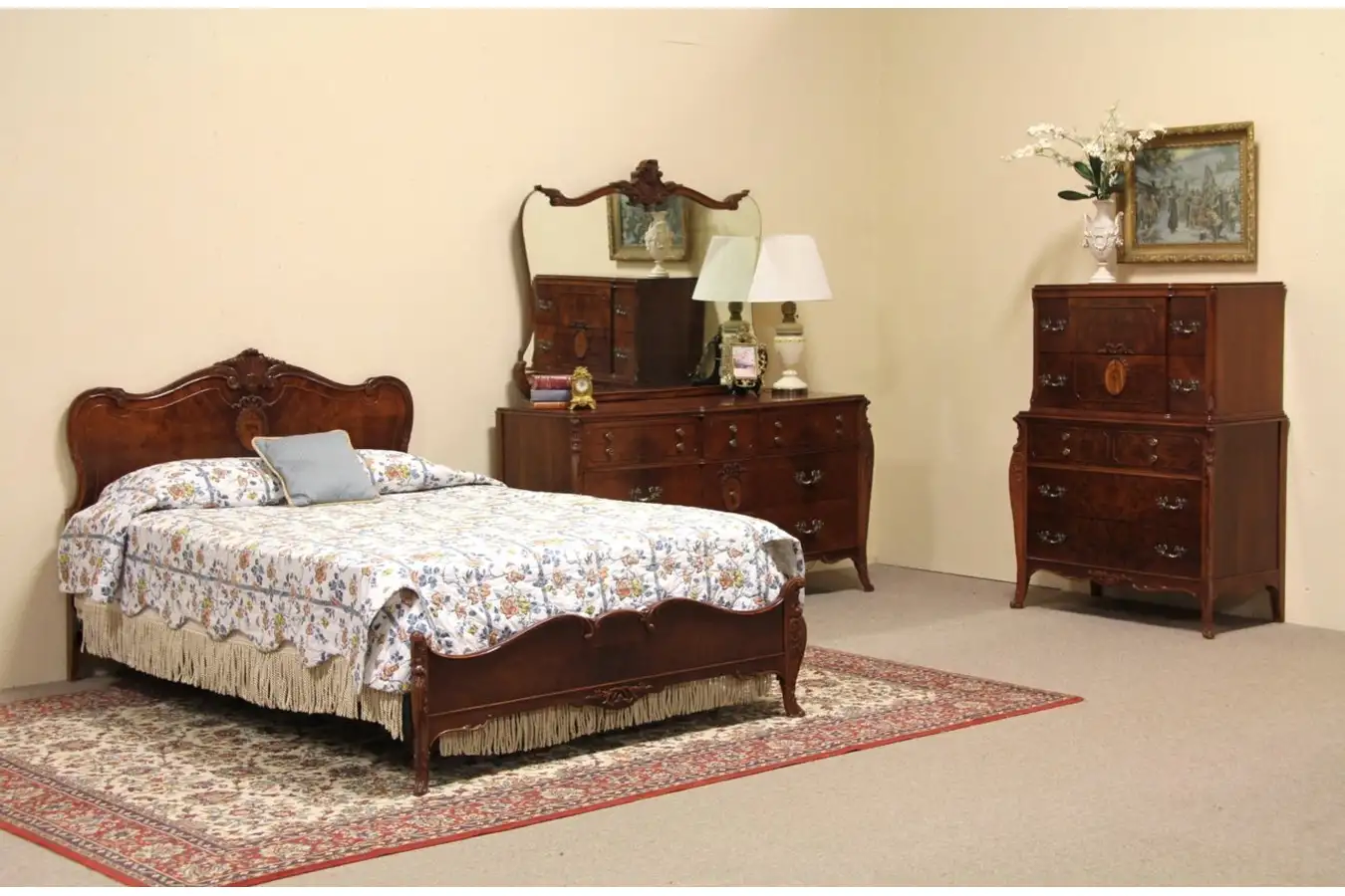 Matched burl walnut panels have richly carved edges with inlaid marquetry medallions. The satiny finish is excellent on this exceptionally well crafted American vintage furniture. Interiors are finished, dovetailed drawers have original heavy weight hardware.