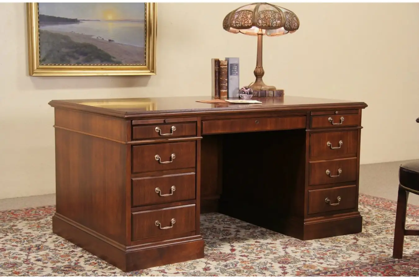 Signed by noted executive office maker, "Jofco of Jasper, Indiana," this traditional walnut desk is about 30 years old.