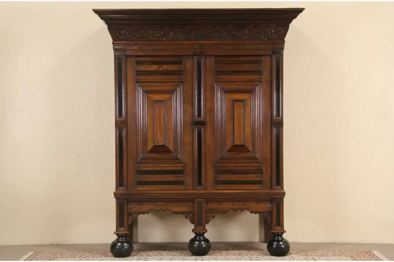 This Netherlands traditional "Kas" or armoire is a dowry cabinet hand made in the early 1800's. Fine grained oak has accents of genuine rosewood and ebony are from colonies in the Dutch West Indies.