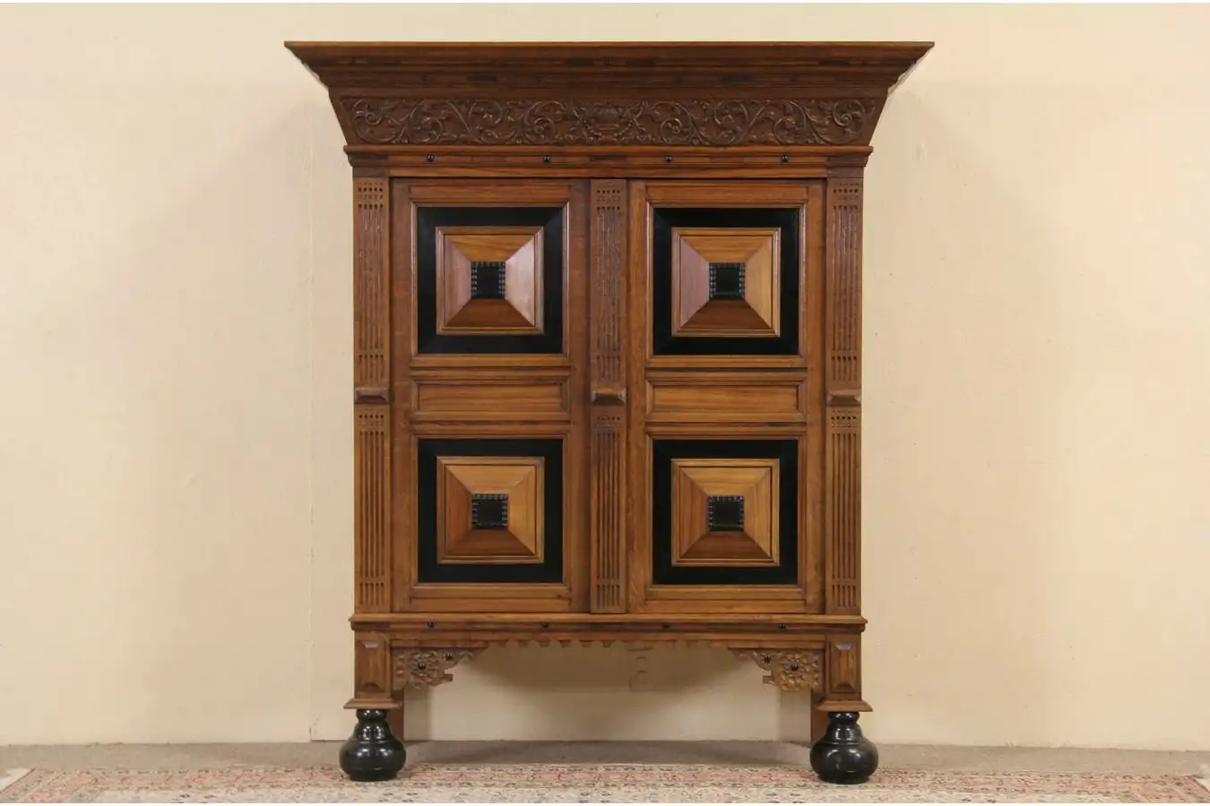 This Netherlands traditional "Kas" or armoire is a dowry cabinet hand made in the early 1900's. Fine grained oak has accents of genuine rosewood and ebony from colonies in the Dutch West Indies.