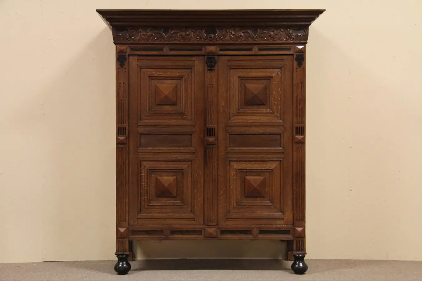 The traditional dowry cupboard in Holland is a "Kas" or armoire like this picturesque example. Designed to display the affluence and prominence of a bride's family, this imposing antique was entirely hand crafted of native oak, plus rare and valuable exotic woods from Dutch colonies including ebony and mahogany. Classic deep moldings are distinguished, backsides of the panels are chamfered.