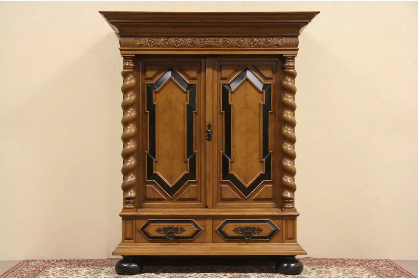 Classic deep moldings and a monumental crown are distinguished, spiral columns are a true right and left pair.