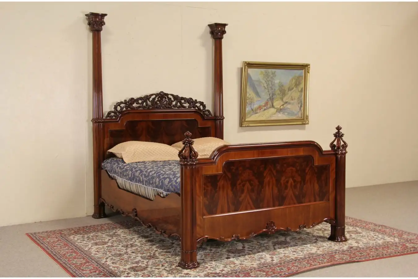 "Towers" on the footboards posts, the filigree headboard crest and Ionic cap columns are dramatic. The demonstrator queen size mattress and spring unit in photos is together 21" thick.