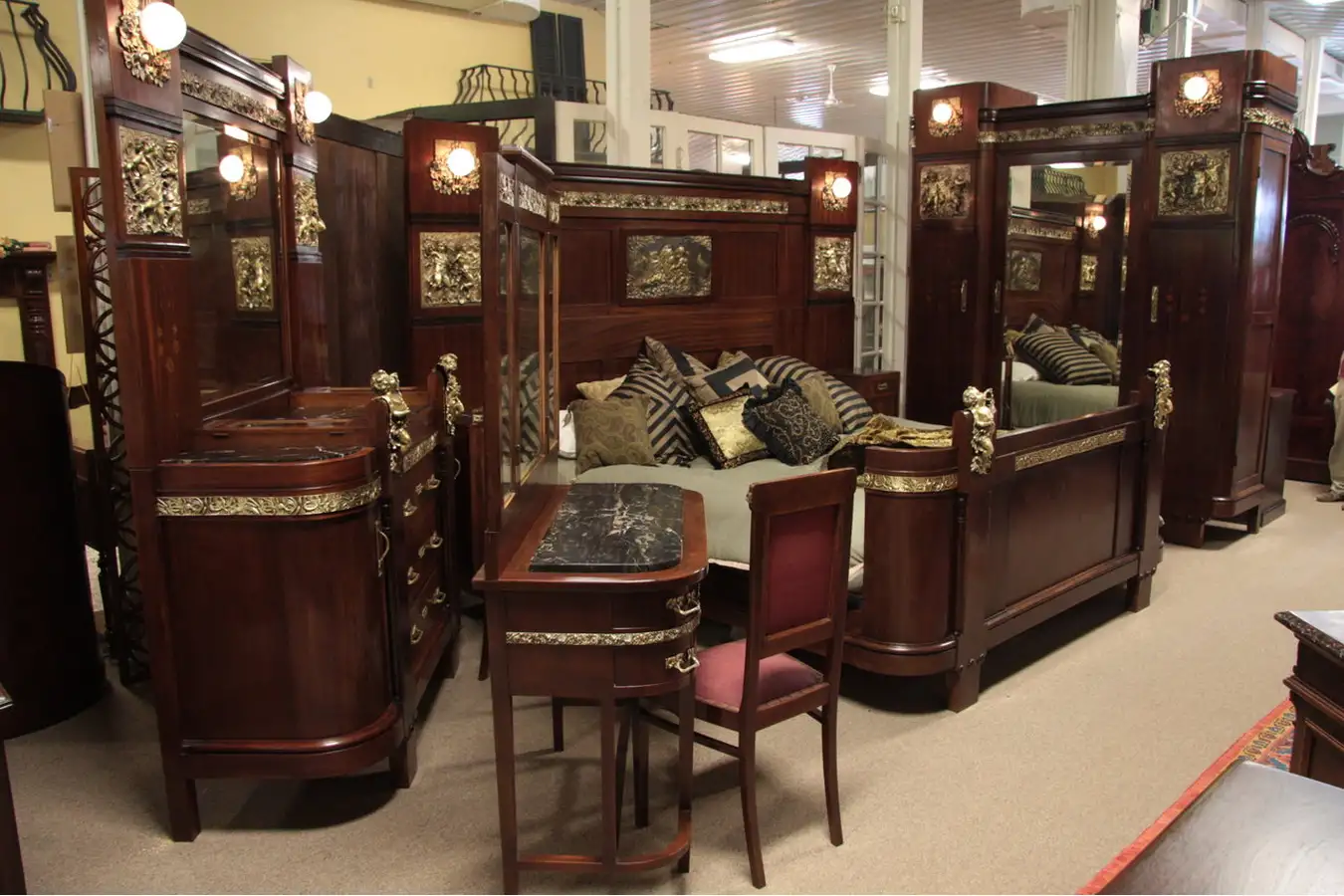 Sleep like royals in this awe-inspiring antique bedroom set, handmade by virtuoso cabinetmakers and bronze sculptors. Created for an historic palazzo in northern Italy about 1915, this utterly palatial bedroom set includes a king size bed with two built-in nightstands, a triple armoire, a dresser or chest with jewel boxes, a dressing table or desk plus 2 side chairs.