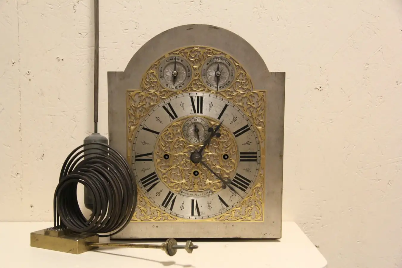 The movement works and keeps accurate time for us, but because there is no case, we cannot operate the Whittington or Westminster chimes or strike. We see that one of the flat wire gongs is missing, also several hammers.