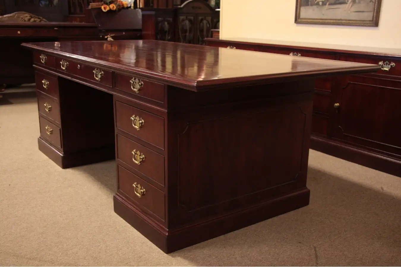 The rich red-brown finish is excellent with only minor mars at the edges, heavy brasses are original. Drawers have solid oak dovetailed sides and slide smoothly. The burned in Kittinger signature is in a drawer on both pieces. A substantial overhand on the desk affords more work area, and is helpful in conference settings as well.