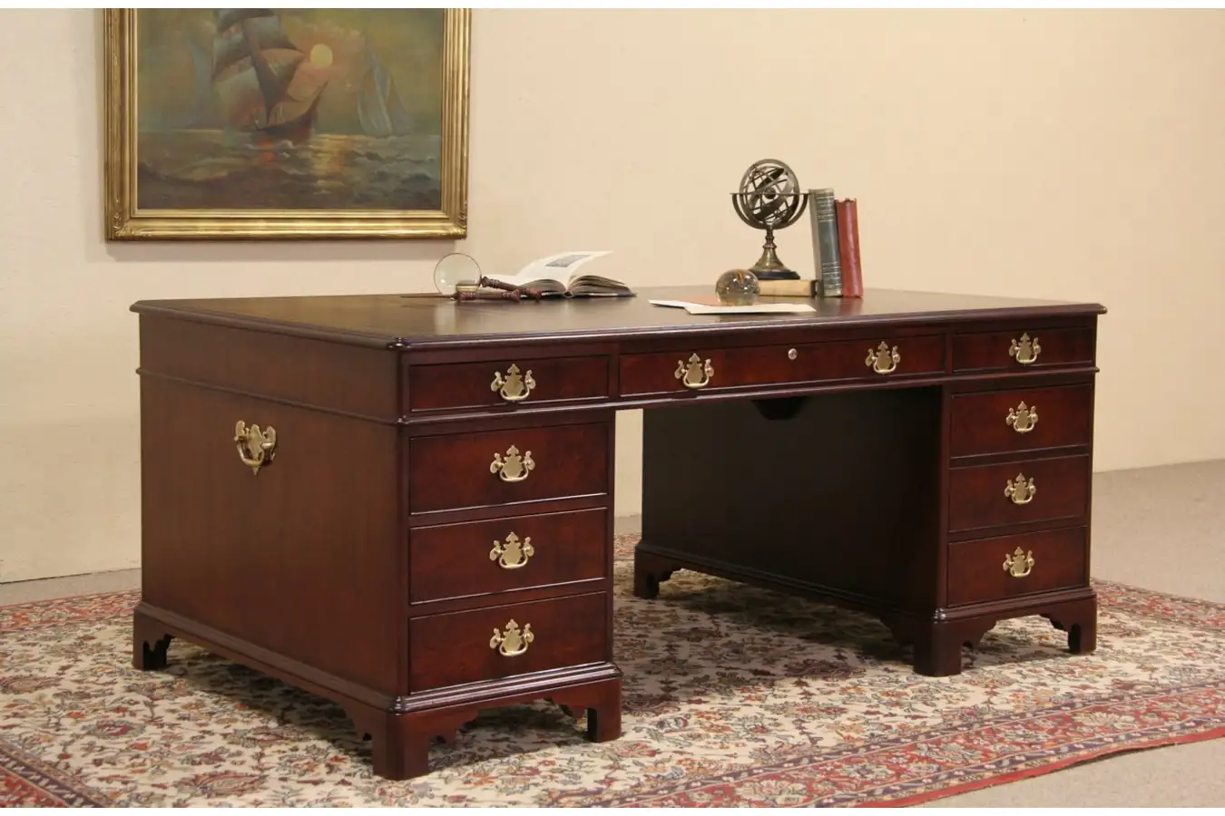 Signed by famous maker, "Kittinger of Buffalo, NY," this executive partner desk from about 40 years ago has a gold tooled leather top.