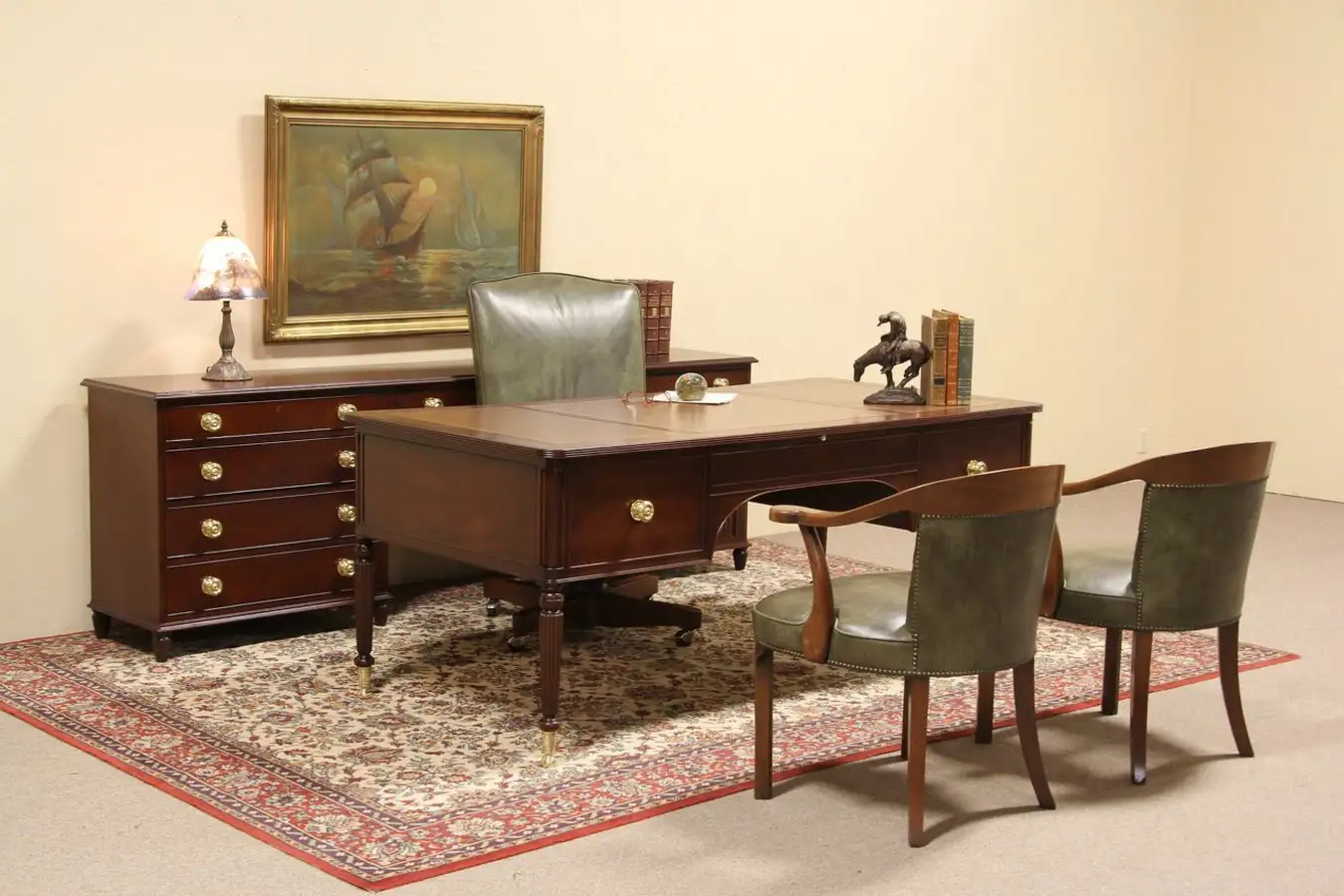 Signed by premier American maker, "Kittinger of Buffalo, NY," this executive writing desk and credenza is about 40 years old.