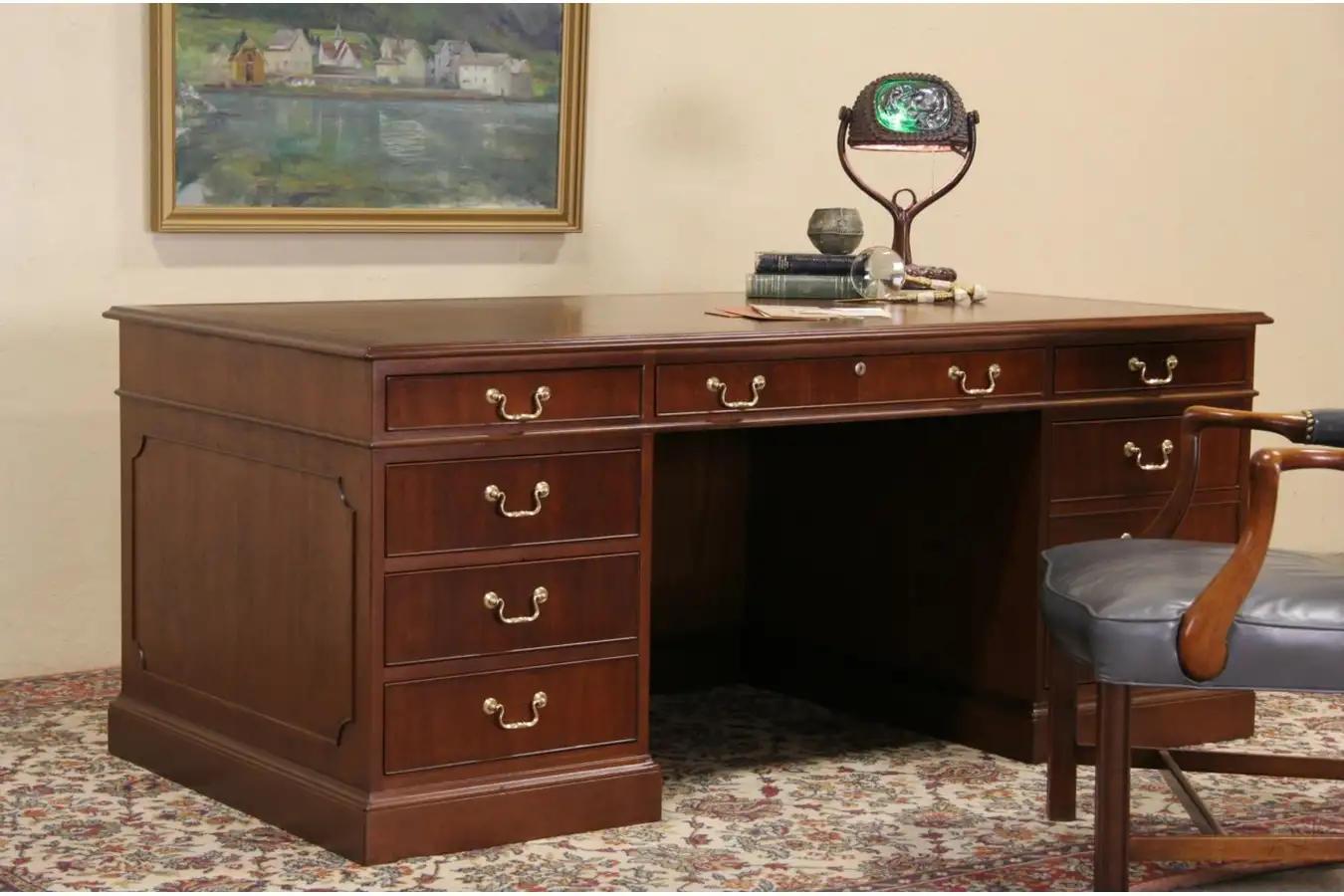 Signed by premier maker, "Kittinger of Buffalo, NY," this traditional executive desk is superior quality throughout.