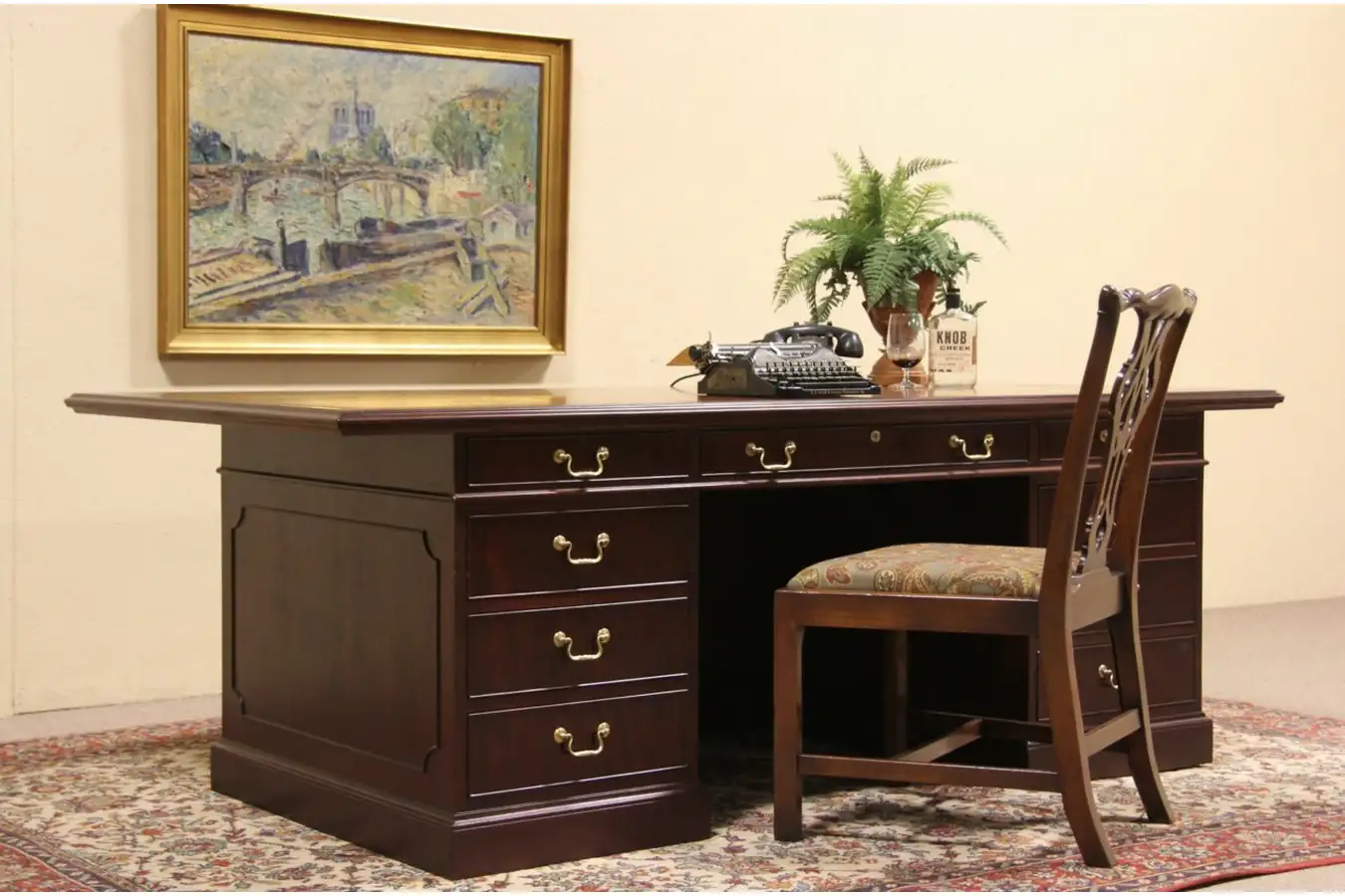 Signed by premier maker, "Kittinger of Buffalo," NY, this superior quality executive desk from about 25 years ago has enough overhang to use for conferences.