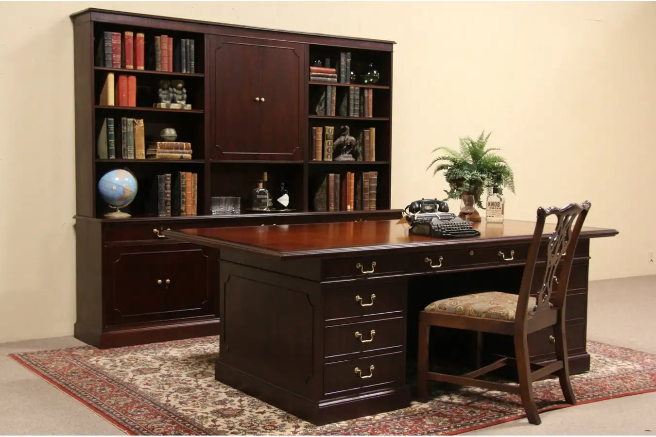 Signed by premier maker, "Kittinger of Buffalo," NY, this superior quality executive office suite from about 25 years ago includes a desk with enough overhang to use for conferences plus a credenza with lateral file drawers and a bookcase top.