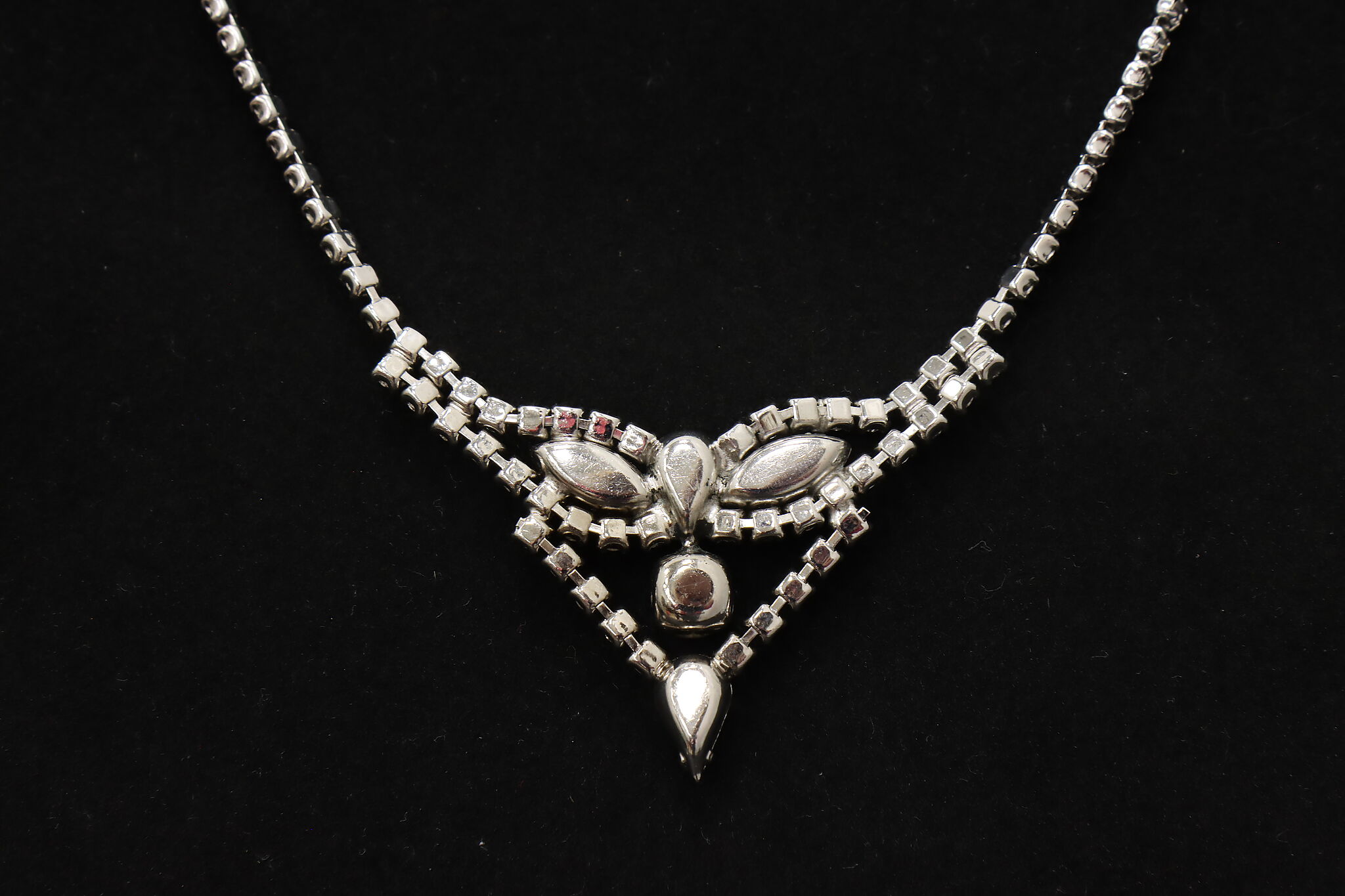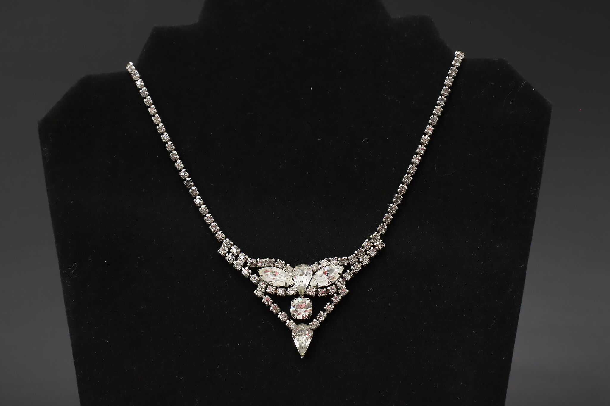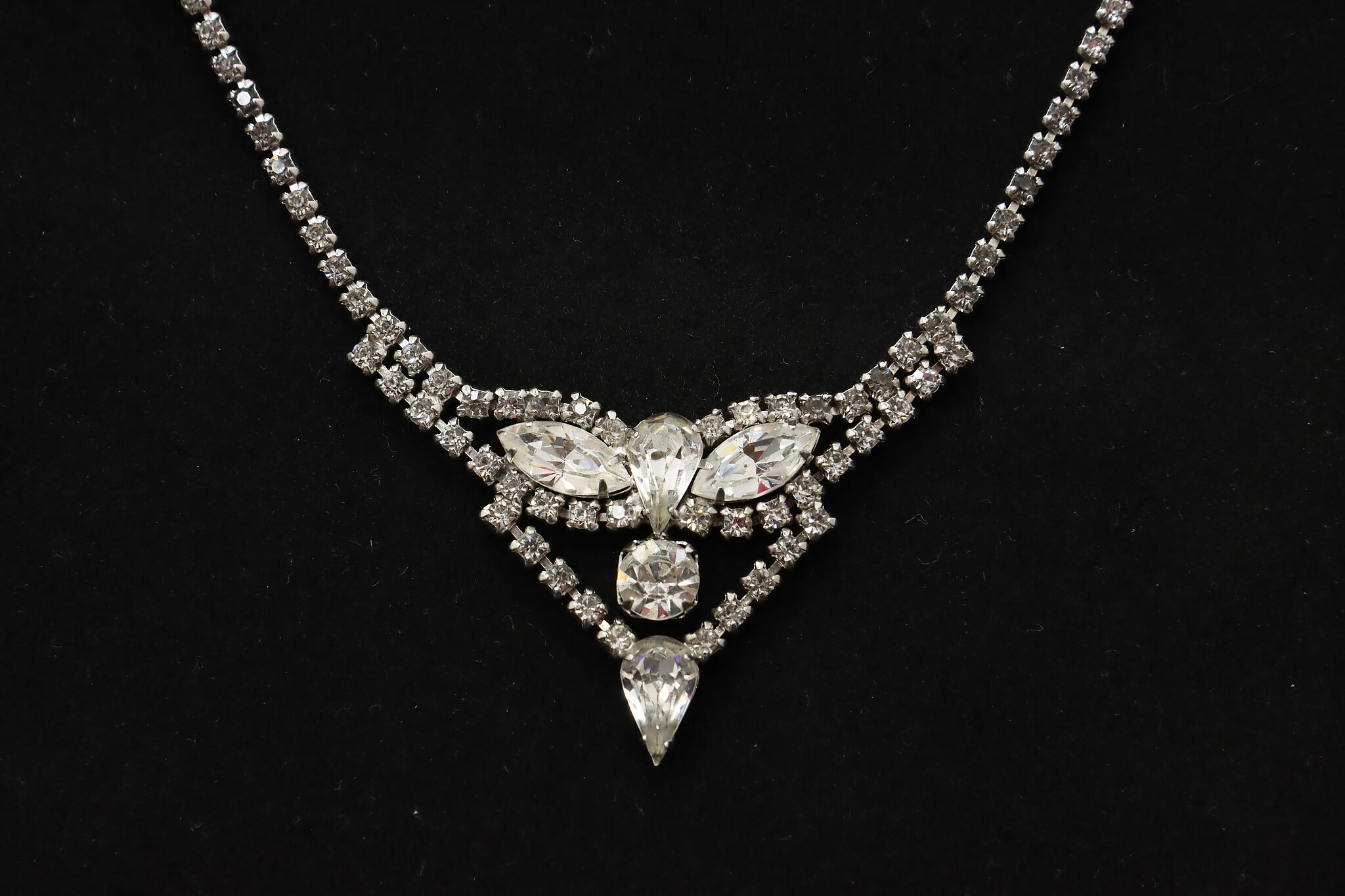 Elegant vintage necklace by Kramer featuring a classic rhinestone chain leading to a dramatic front drop design with marquise and round clear stones. The dimensional centerpiece creates beautiful light reflection and refined mid-century glamour.