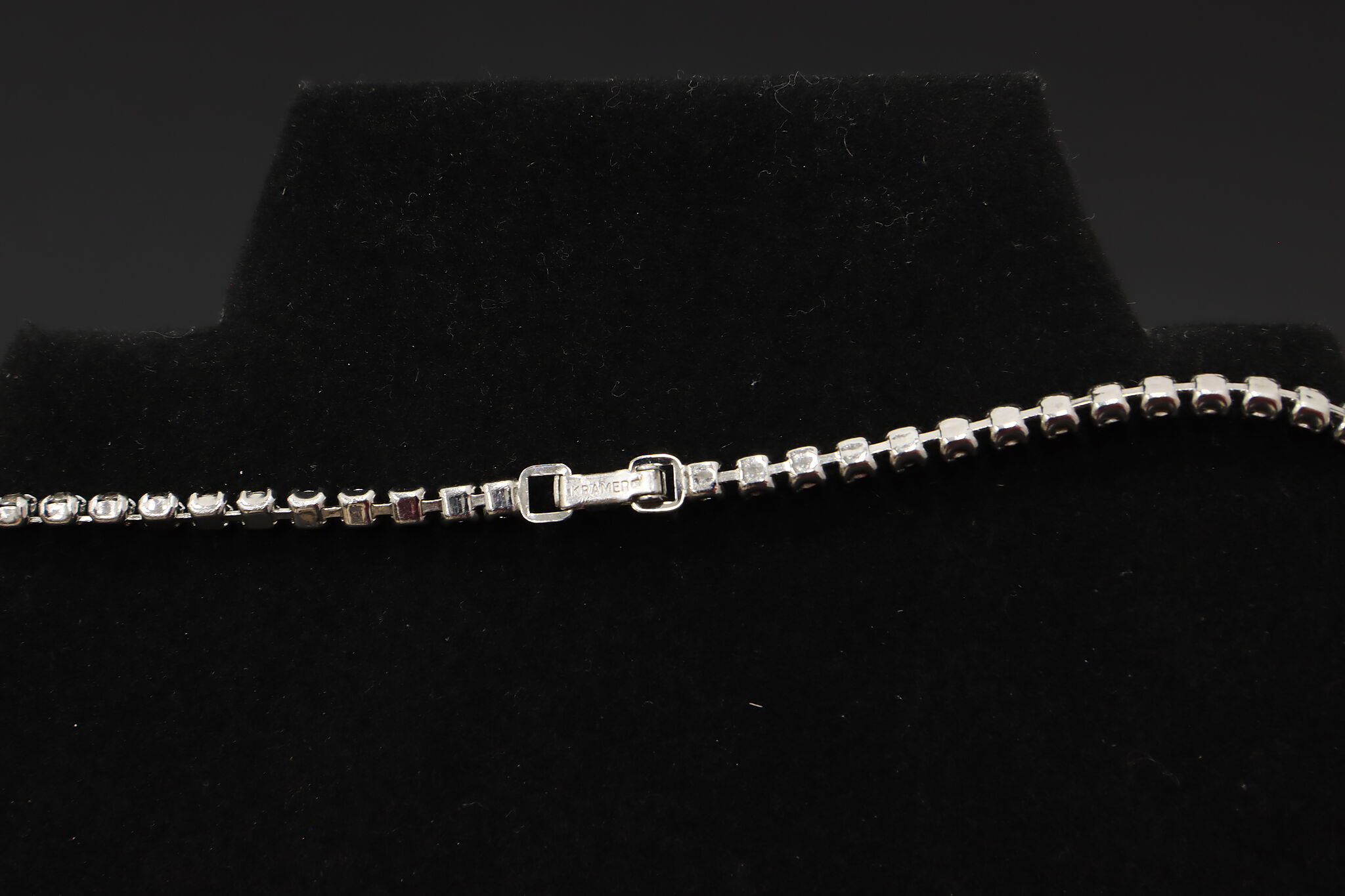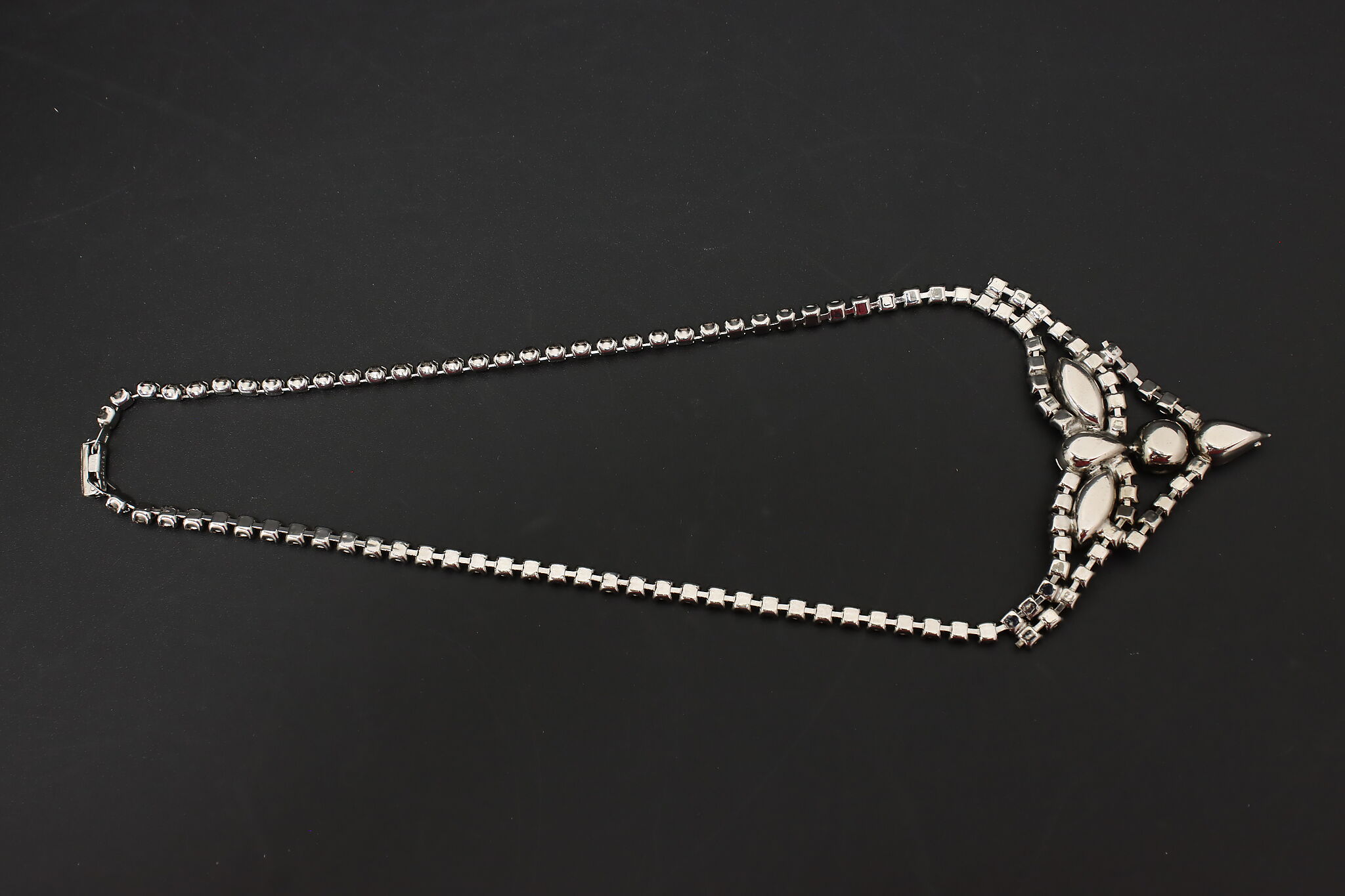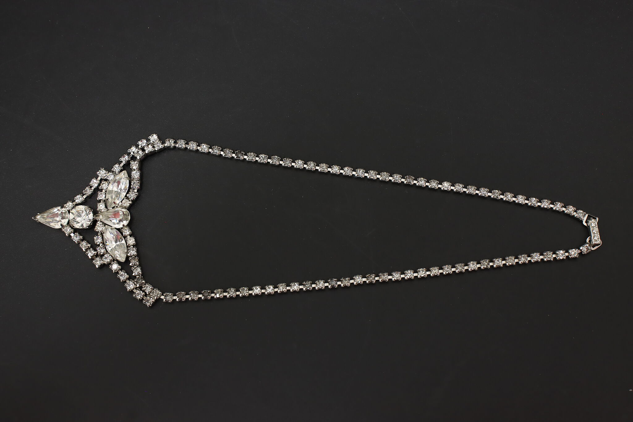Elegant vintage necklace by Kramer featuring a classic rhinestone chain leading to a dramatic front drop design with marquise and round clear stones. The dimensional centerpiece creates beautiful light reflection and refined mid-century glamour.