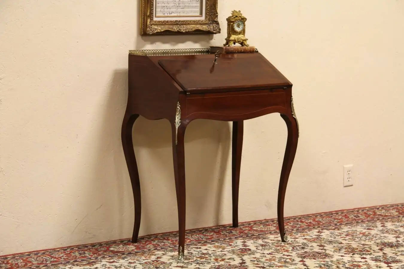 Beautifully crafted about 1900, a delicate French secretary or writing desk has original bronze mounts and gallery, it is artistically shaped and curved on every side.