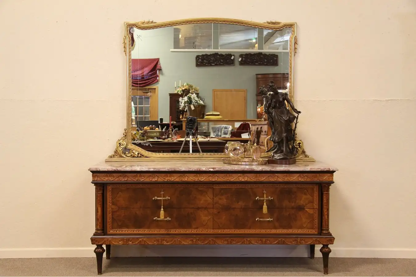 The satiny finish is excellent, enhancing the intricate natural wood grain. Richly grained, the marble top is in superb condition. The removable mirror has reverse etching, the burnished gold frame has minor touchups. Brasses are original.