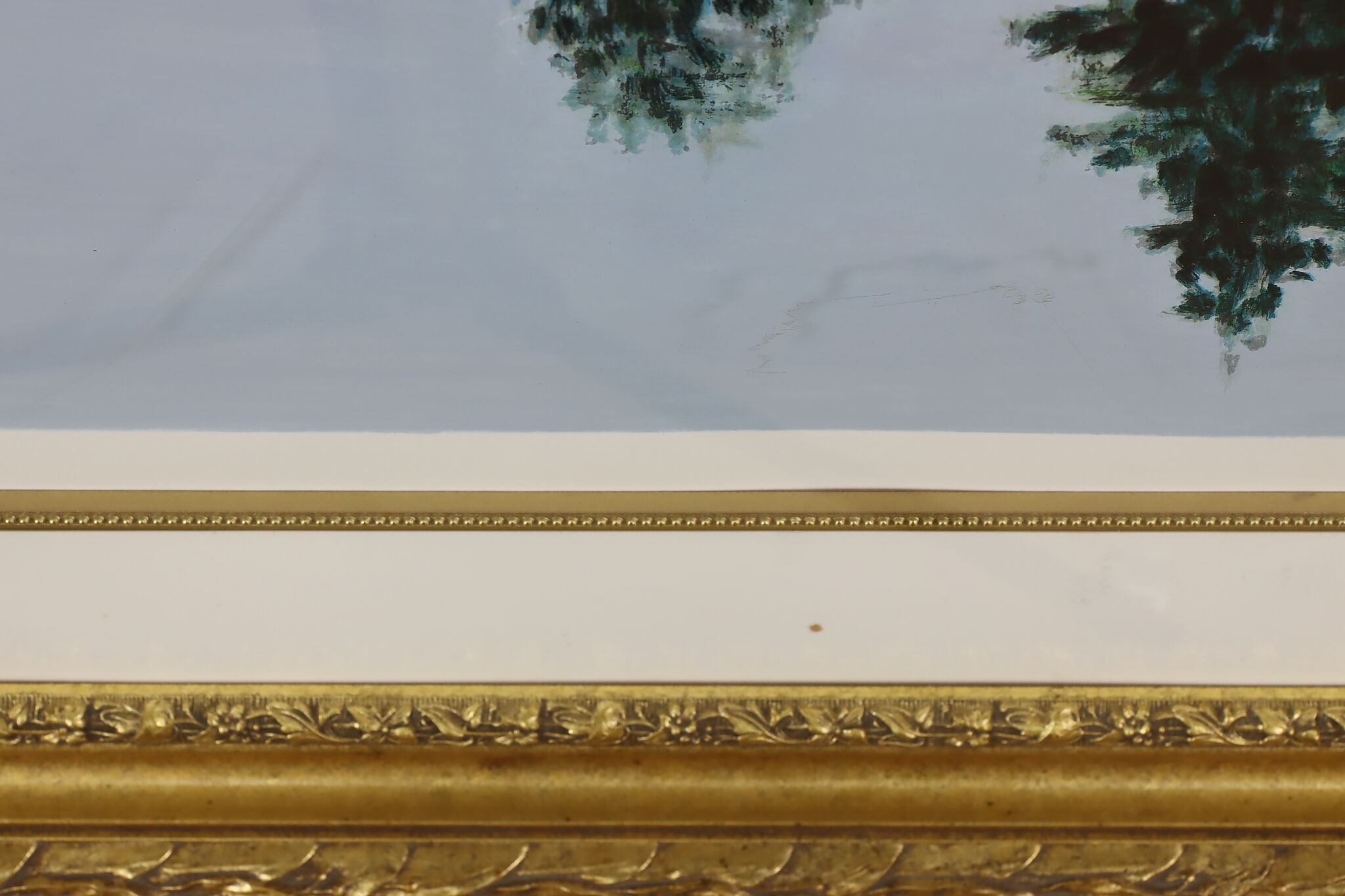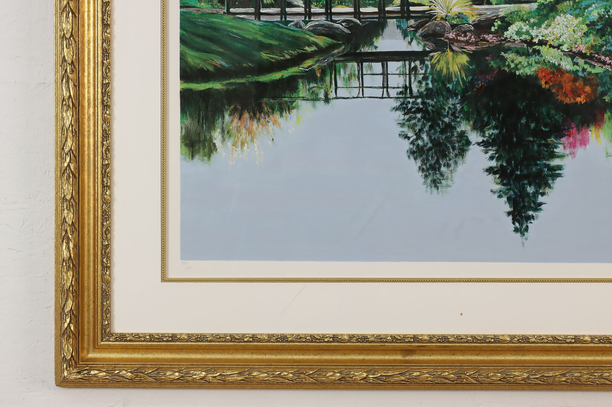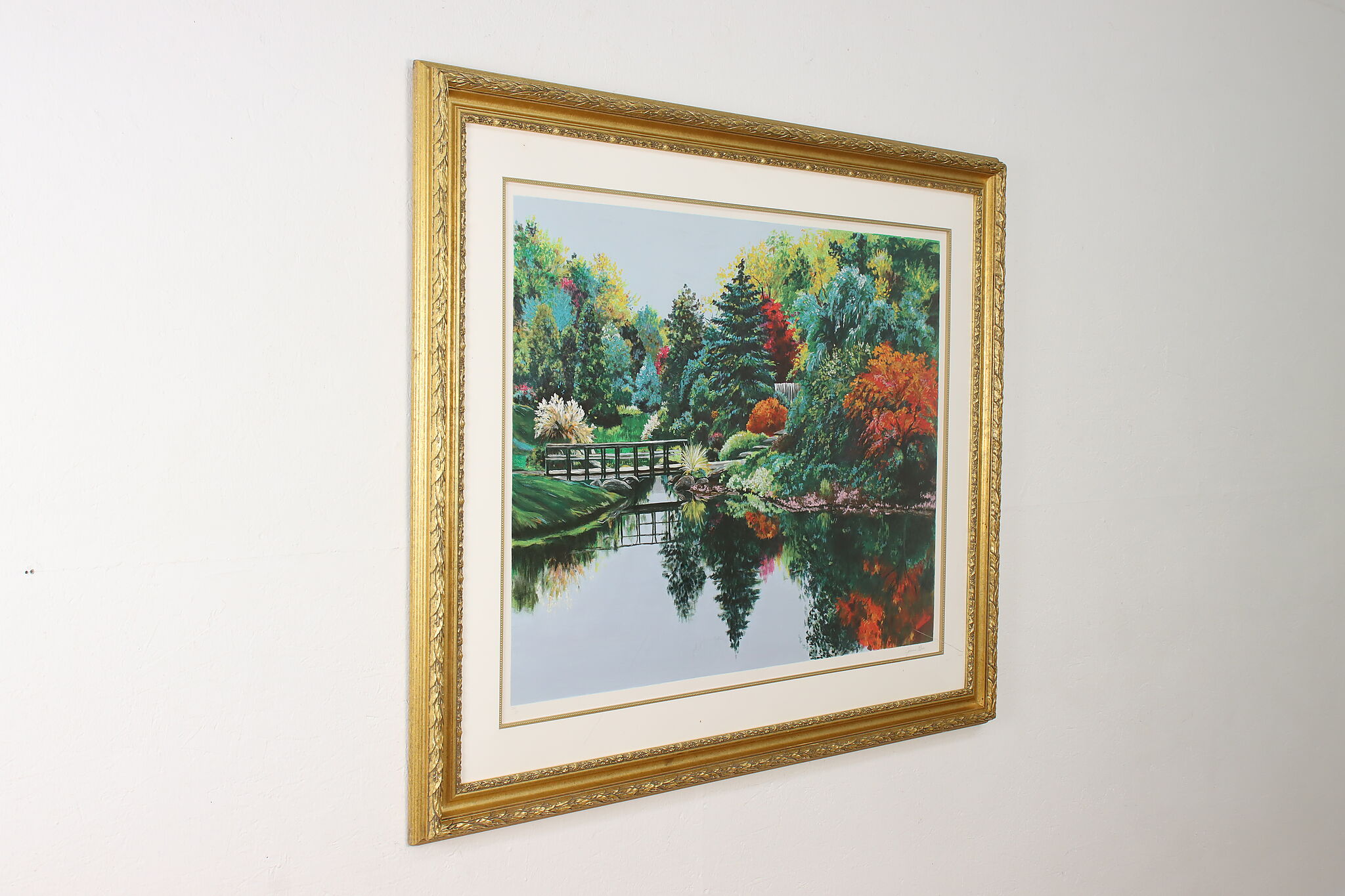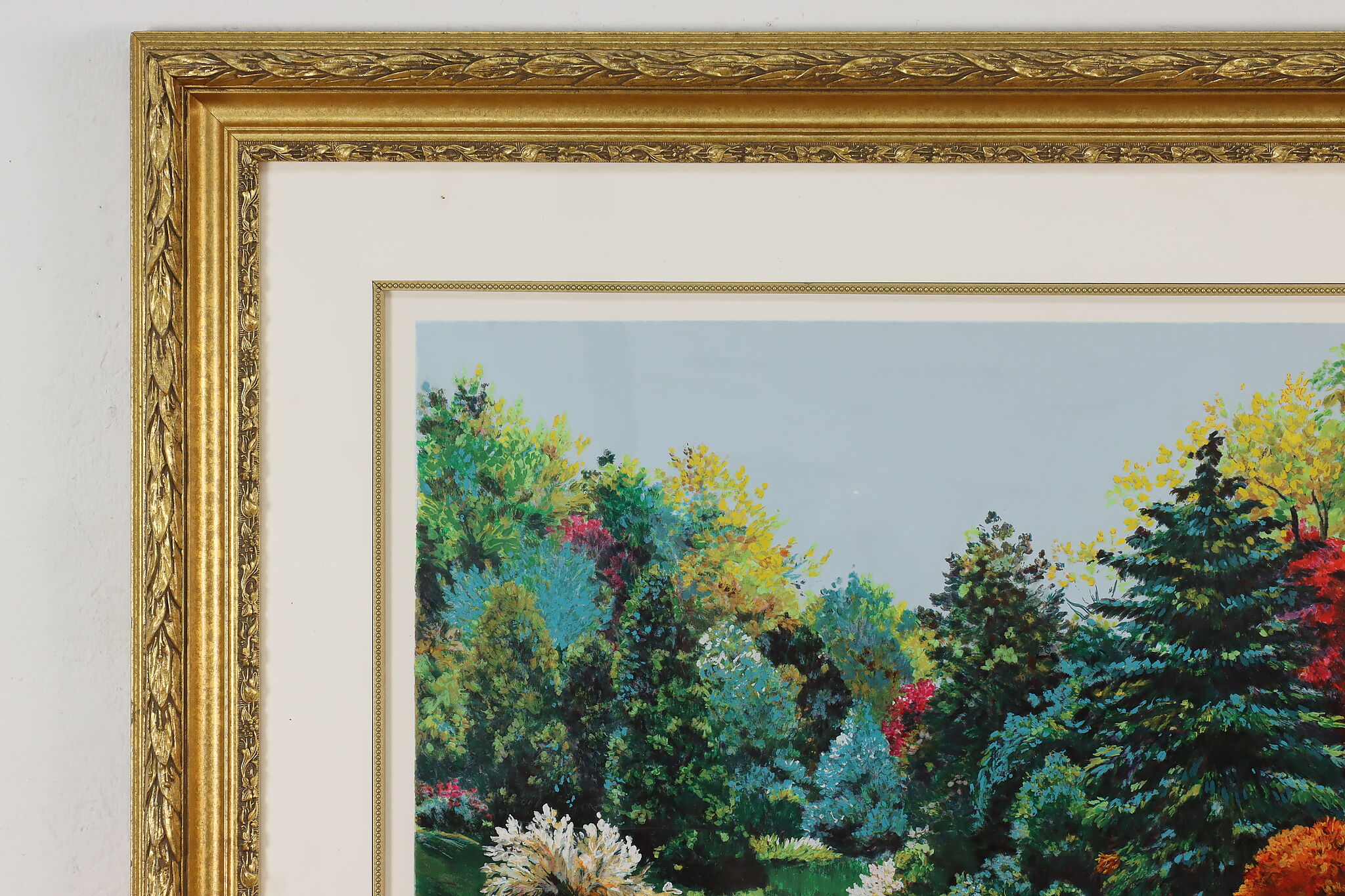 This beautifully detailed serigraph print of a lake park in summer would be a lovely addition to a conference room or business entry.