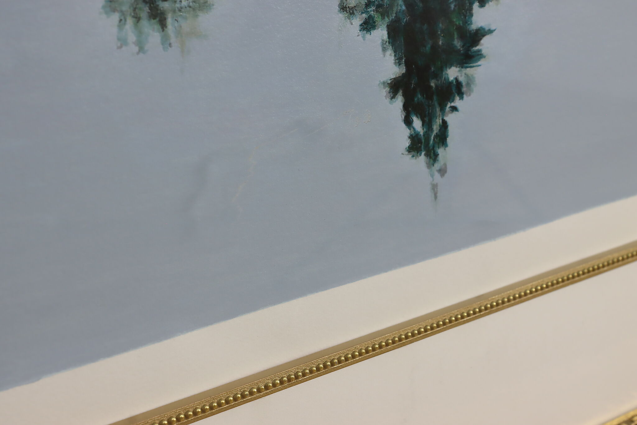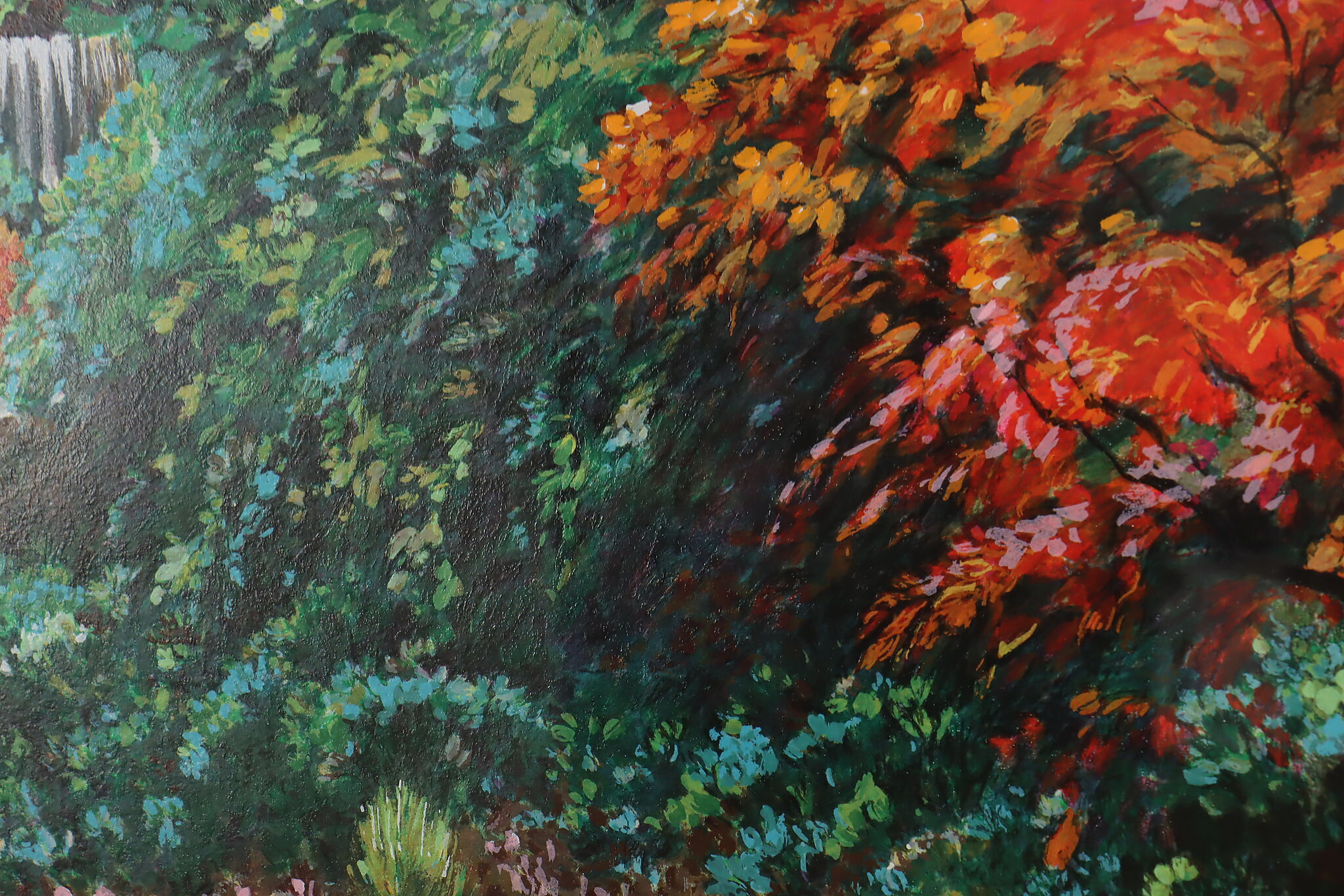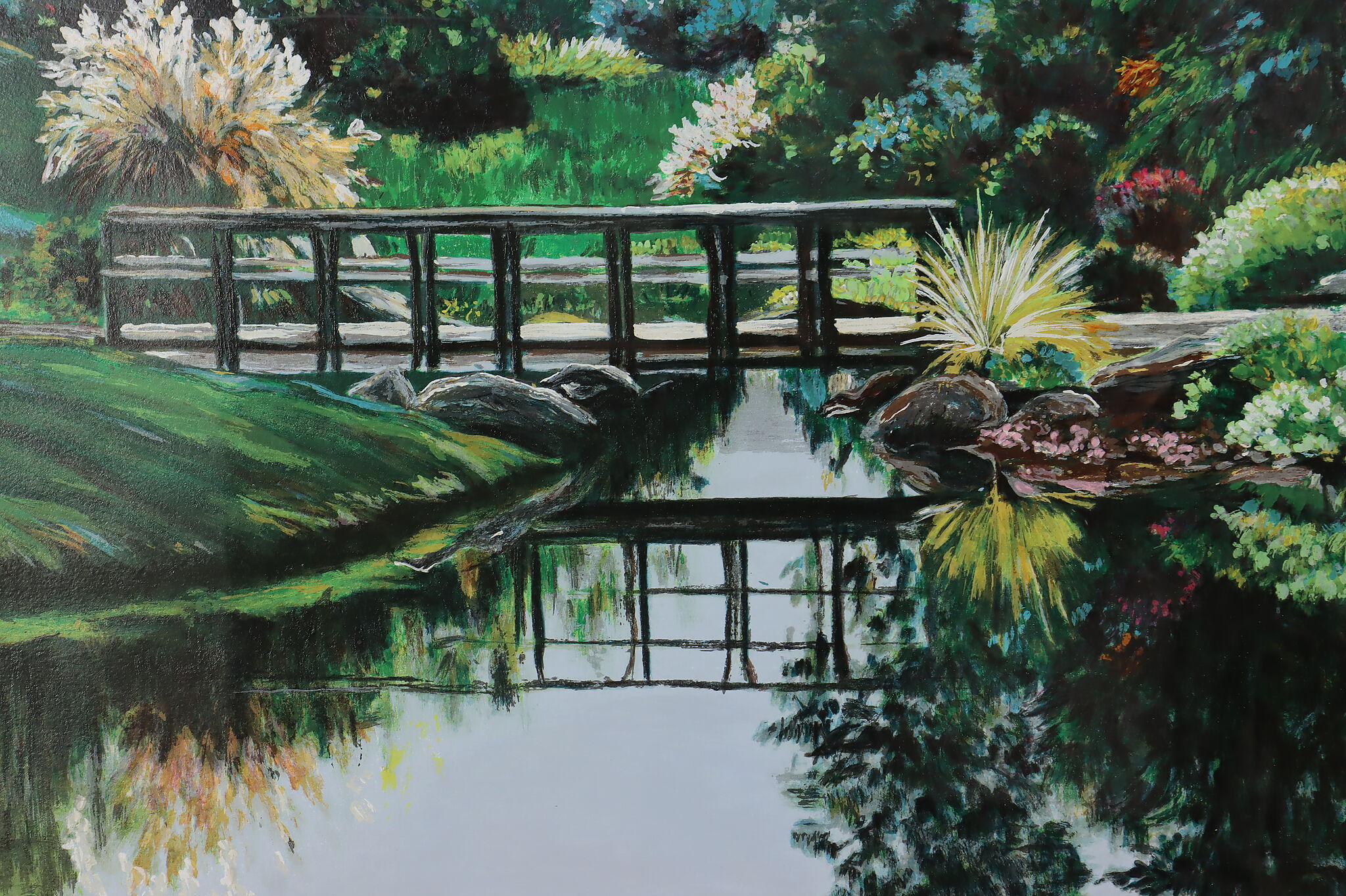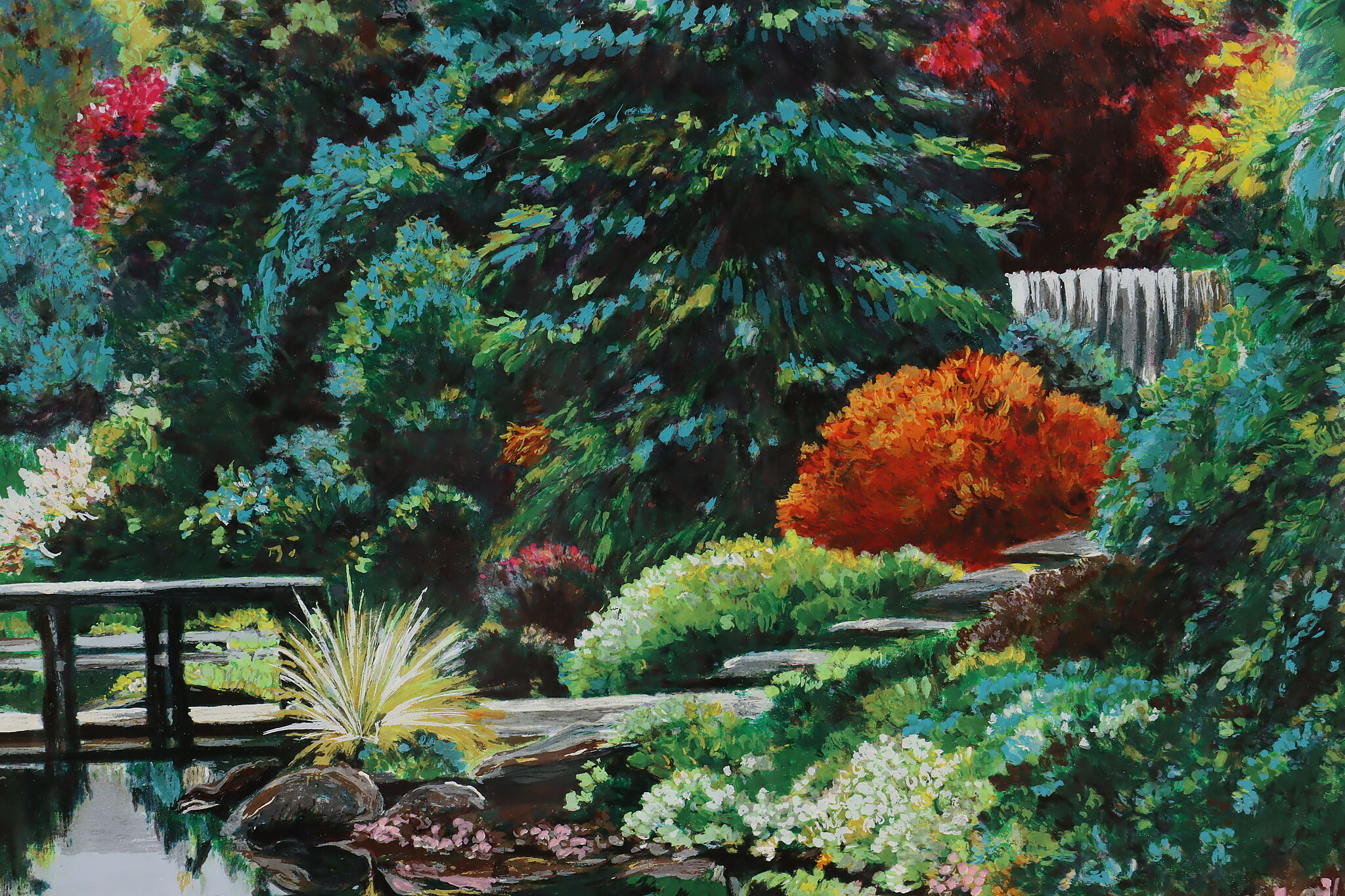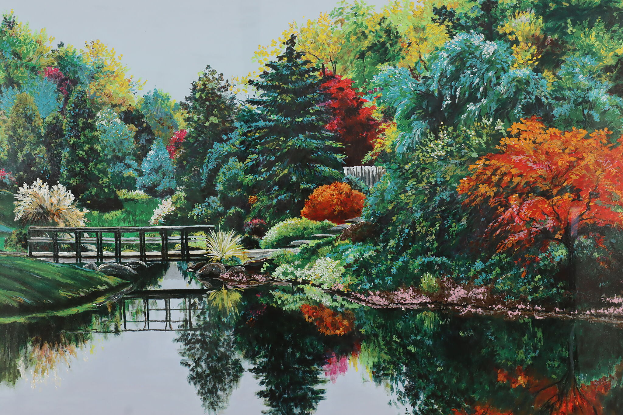 This beautifully detailed serigraph print of a lake park in summer would be a lovely addition to a conference room or business entry.
