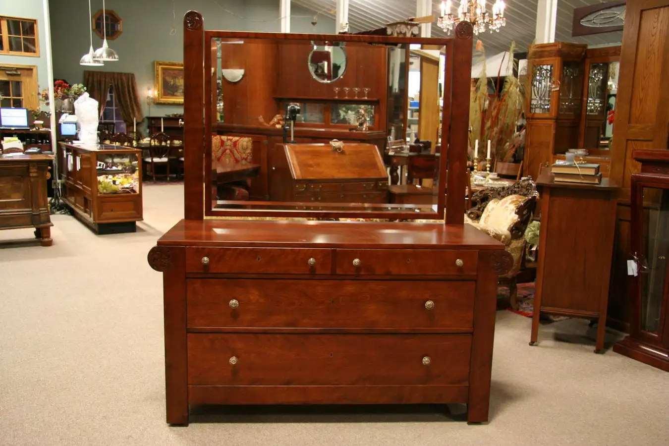 This classic dresser has simple yet elegant lines with four hand carved medallions that reflect the aesthetic movement of around 1900. The solid birch wood has beautiful grain and the finish is in excellent condition in a warm reddish brown color. The drawer sides are oak with hand dove tails, and the construction is exceptional throughout. The large beveled mirror has a few losses in the silver - see photos, but is original and could be resilvered if desired. The bronze filigree knobs are original, and this dresser dates from about 1900. It is exceptionally solid and sturdy and the drawers fit very well and work smoothly. This spacious chest is 5'1" wide, 24" deep, 6' tall, and the top of the base is 33" above the floor.