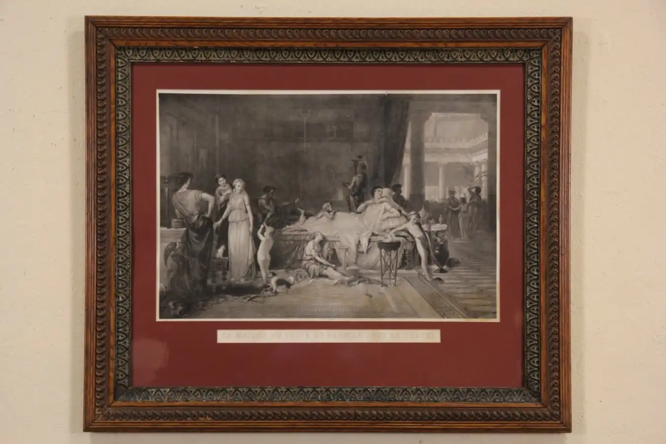 Entitled in French, "The Last Day of Pompeii at the House of the Poetess," this 1870 era engraving has a tear down the center, see photos. Inscriptions indicate this engraving from France is after a painting of "J. Coomans."