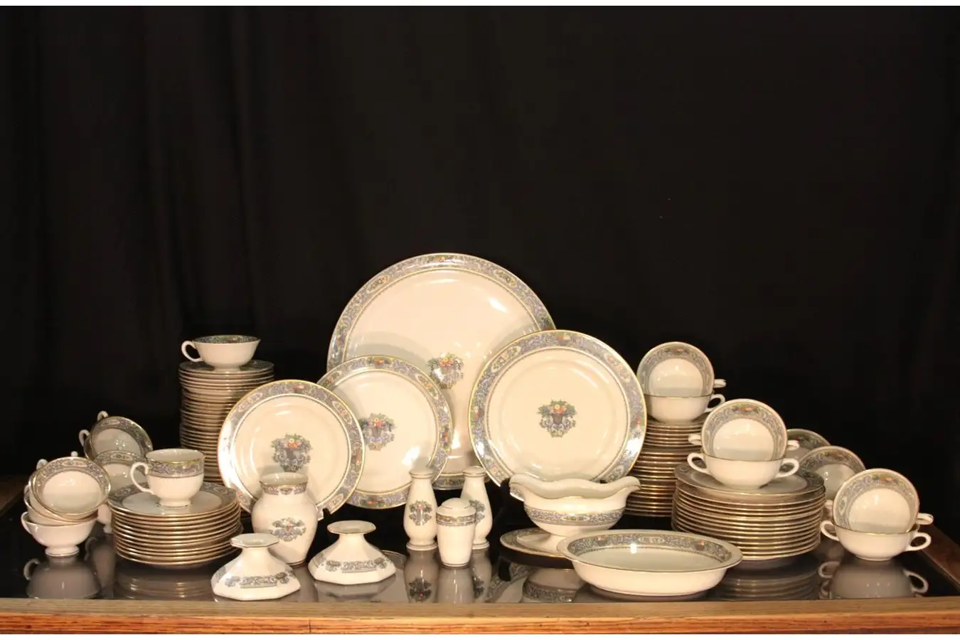 A large set of signed "Lenox" china includes numerous serving pieces, all in the the famous hand-painted "Autumn" pattern. We see no damage to any of these pieces, the gold rims are in excellent unworn condition, and there are minor scratches to some of the plates. This is a glorious set from America's finest maker, Lenox, who has furnished the White House with china. There are Lenox signature crests in black, blue and gold - see photos. There is also an extra coffee cup that isn't listed below.