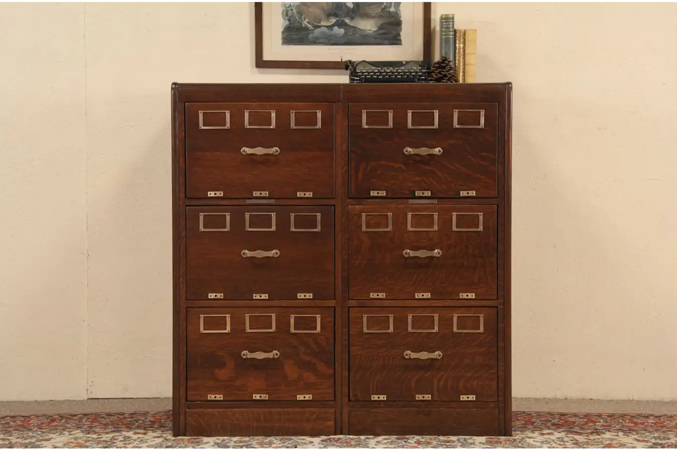 This top quality 6 drawer double stack filing cabinet is signed "Library Bureau, Sole Makers," referring to the Carnegie Foundation which furnished top quality furniture to local libraries all across America.