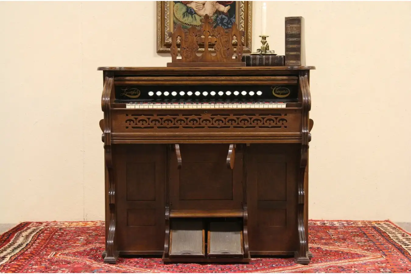 There is a sliding cover over the keys, and more "stops" or voices than is typical. The carved music desk does not appear original on this American made furniture.