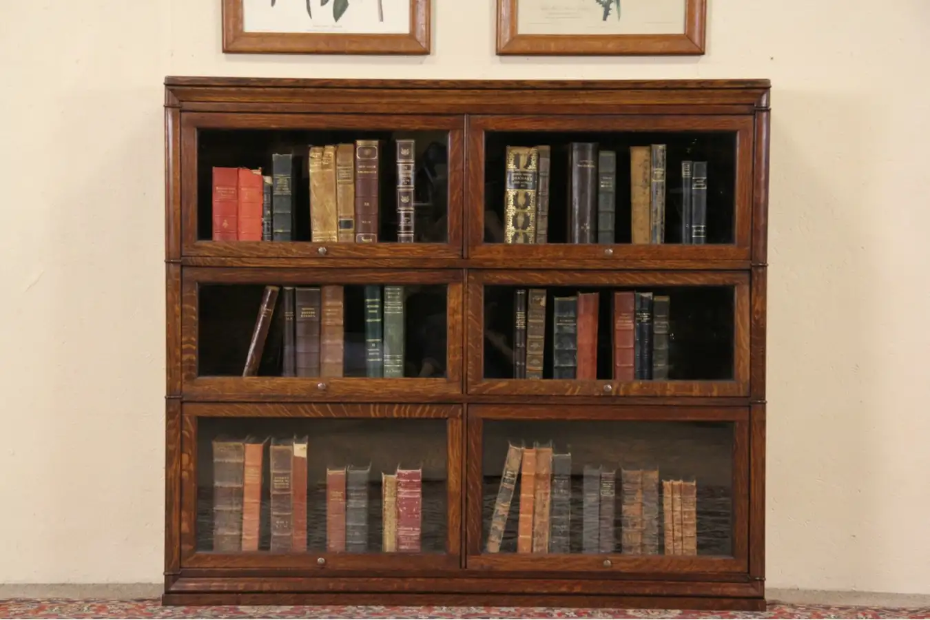 American made library or office furniture. Sections completely disassemble, and fit books up to 10" wide and 9 1/2," 11," and 13" tall. The original finish is very well preserved with a few stains and mars for antique character. Waxed and buffed, all that is needed to maintain their luster is an occasional wipe with a soft dry cloth.