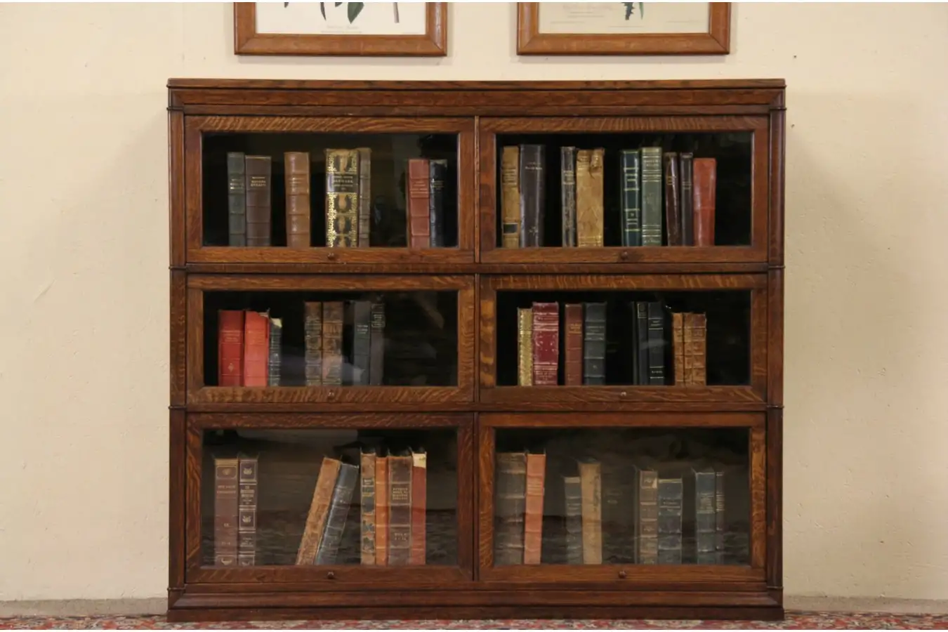 Original wavy glass doors have original wood knobs on this American made library or office furniture. Sections completely disassemble, and fit books up to 10" wide and 9 1/2," 11," and 13" tall.