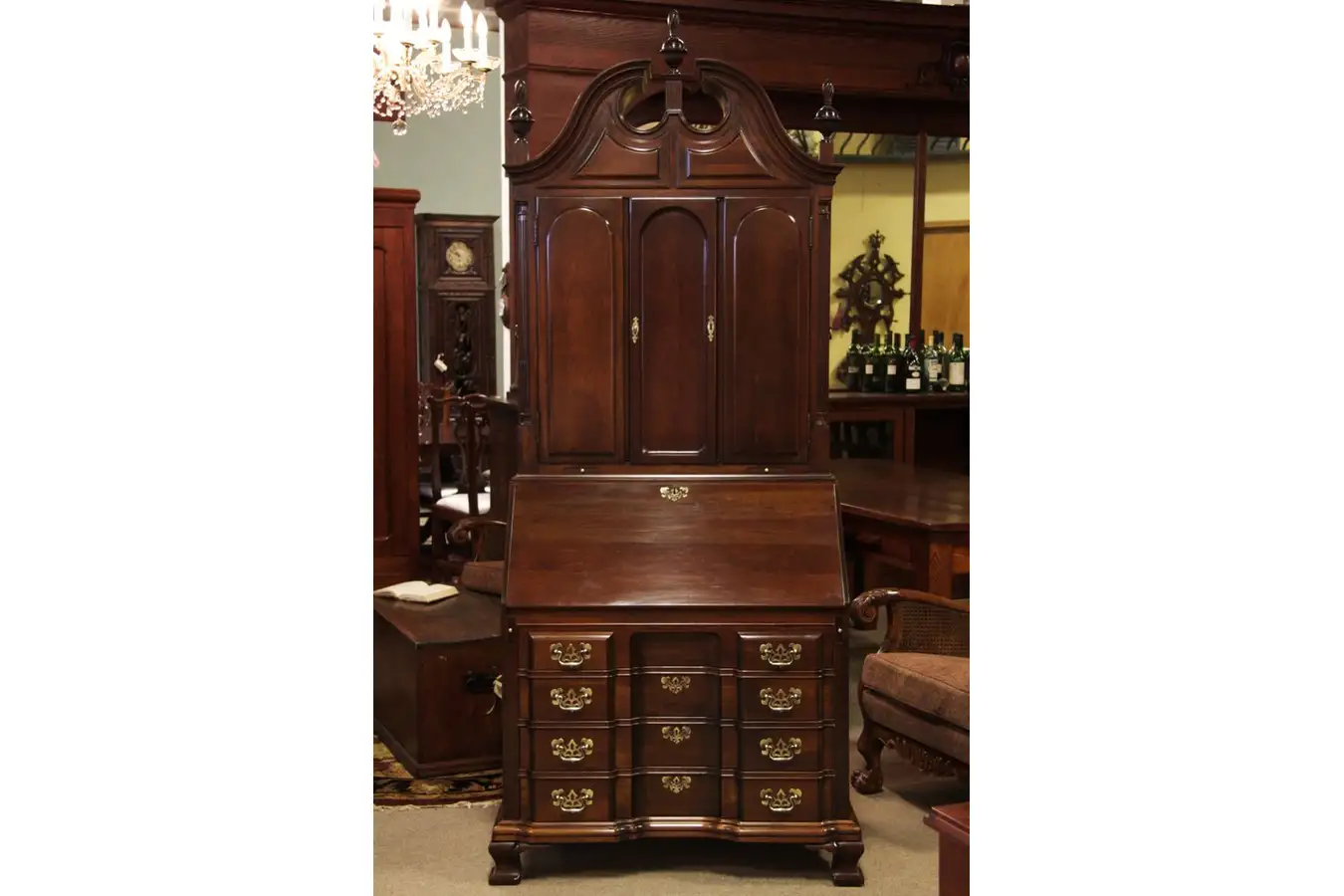 Beautifully made traditional furniture, the arched pediment is especially stunning. Measurements are 39" wide, 22" deep, 7'7" tall, the writing surface is 28" above the floor.