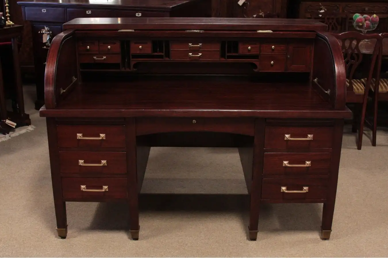 This is a top-of-the-line mahogany version of the legendary American roll top desk. A full 54" wide, there are 2 pull-out writing shelves, and the original cast brass hardware. Inside this authentic antique furniture are tiny compartments, drawers, pencil rests, even brass letter holders on the sides.