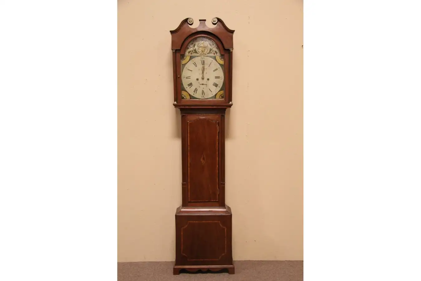 An authentic antique tall case or grandfather clock has a mahogany case and dates from about 1820. This Georgian design clock was expertly hand made in America, but unfortunately was not signed.