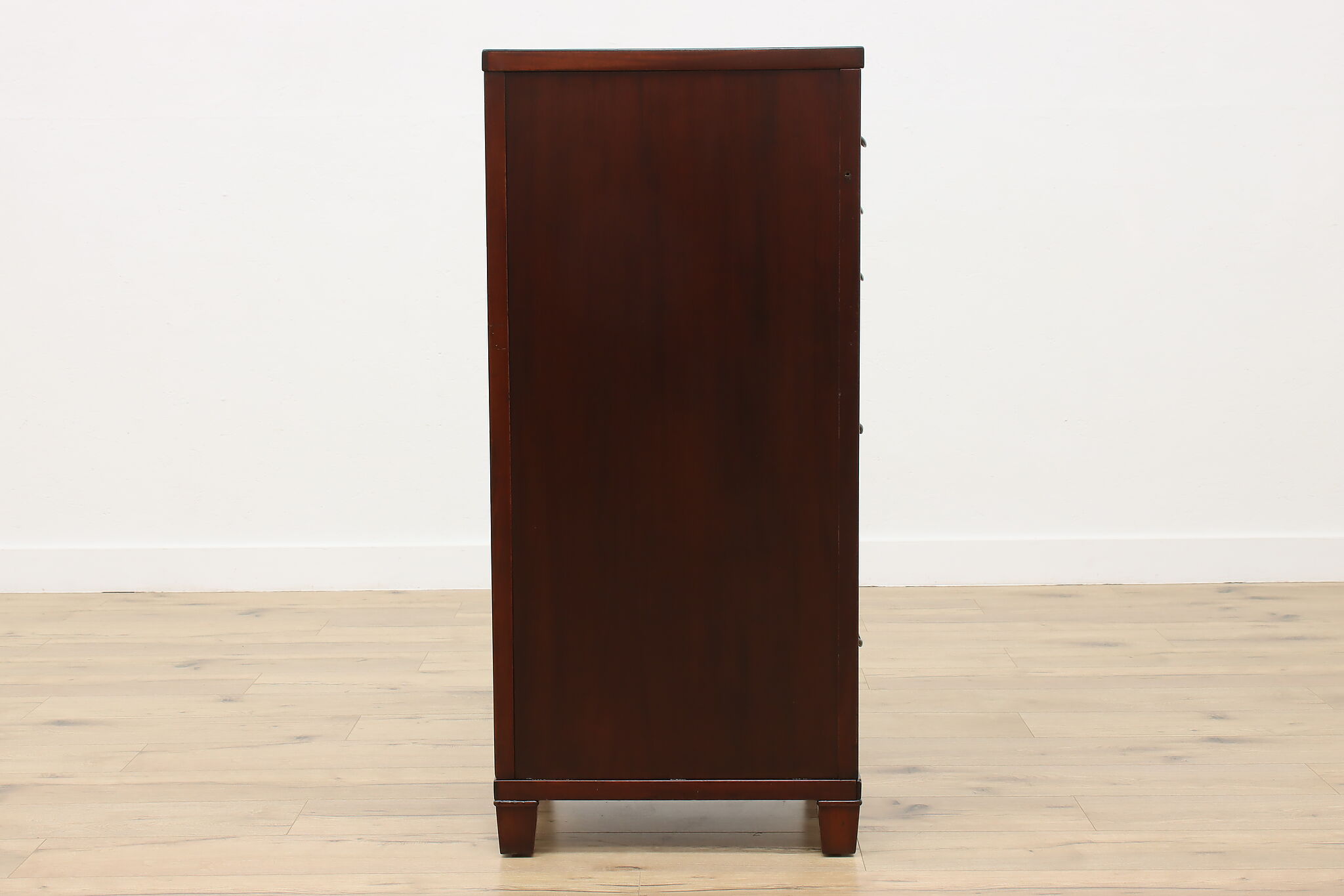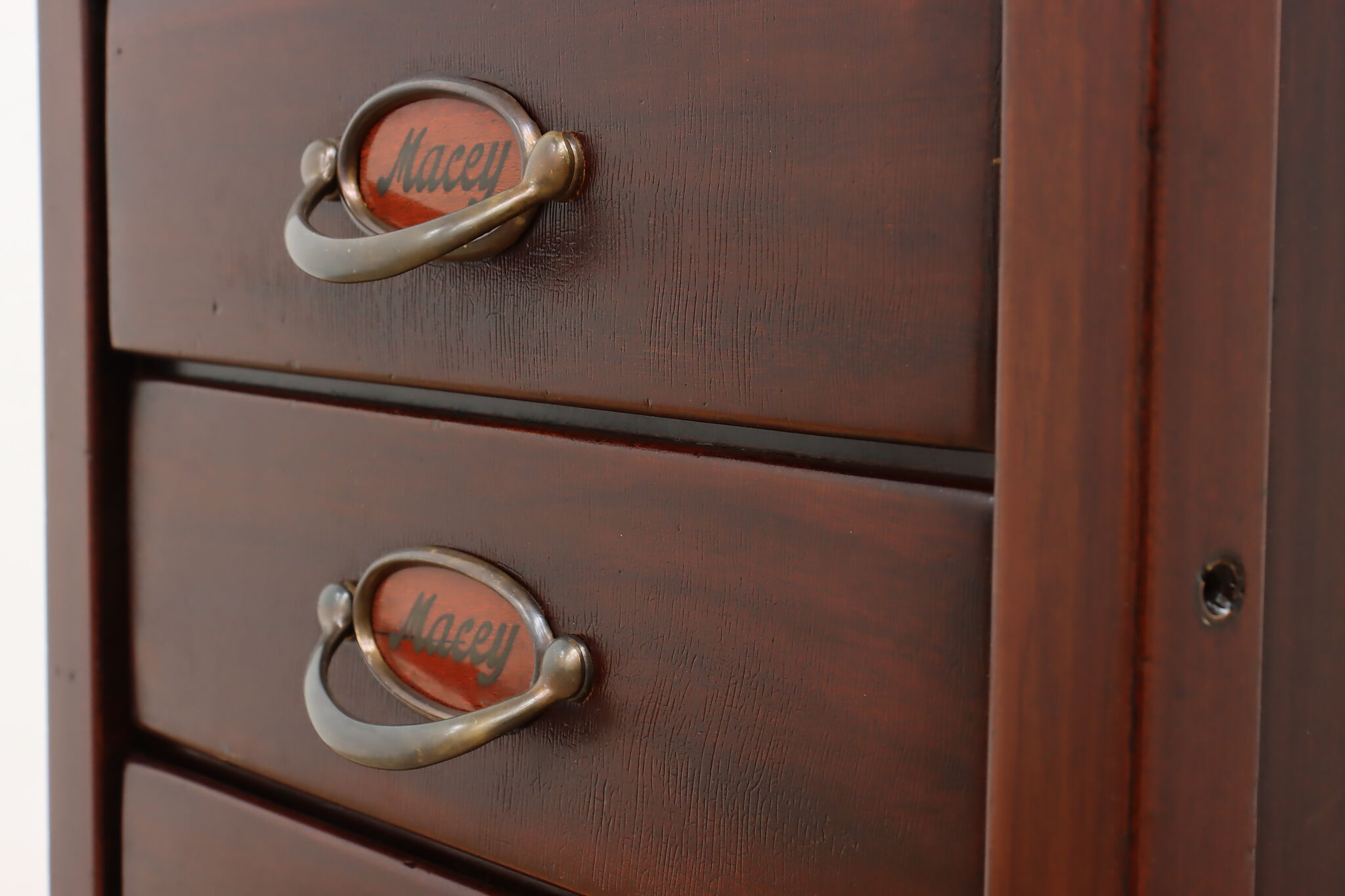 Size is 16" wide, 22" deep and 48" tall. Three top drawers are 12" wide, 18.5" deep and 3.5" tall. Two bottom drawers are 12" wide, 18.5" deep and 10.5" tall.