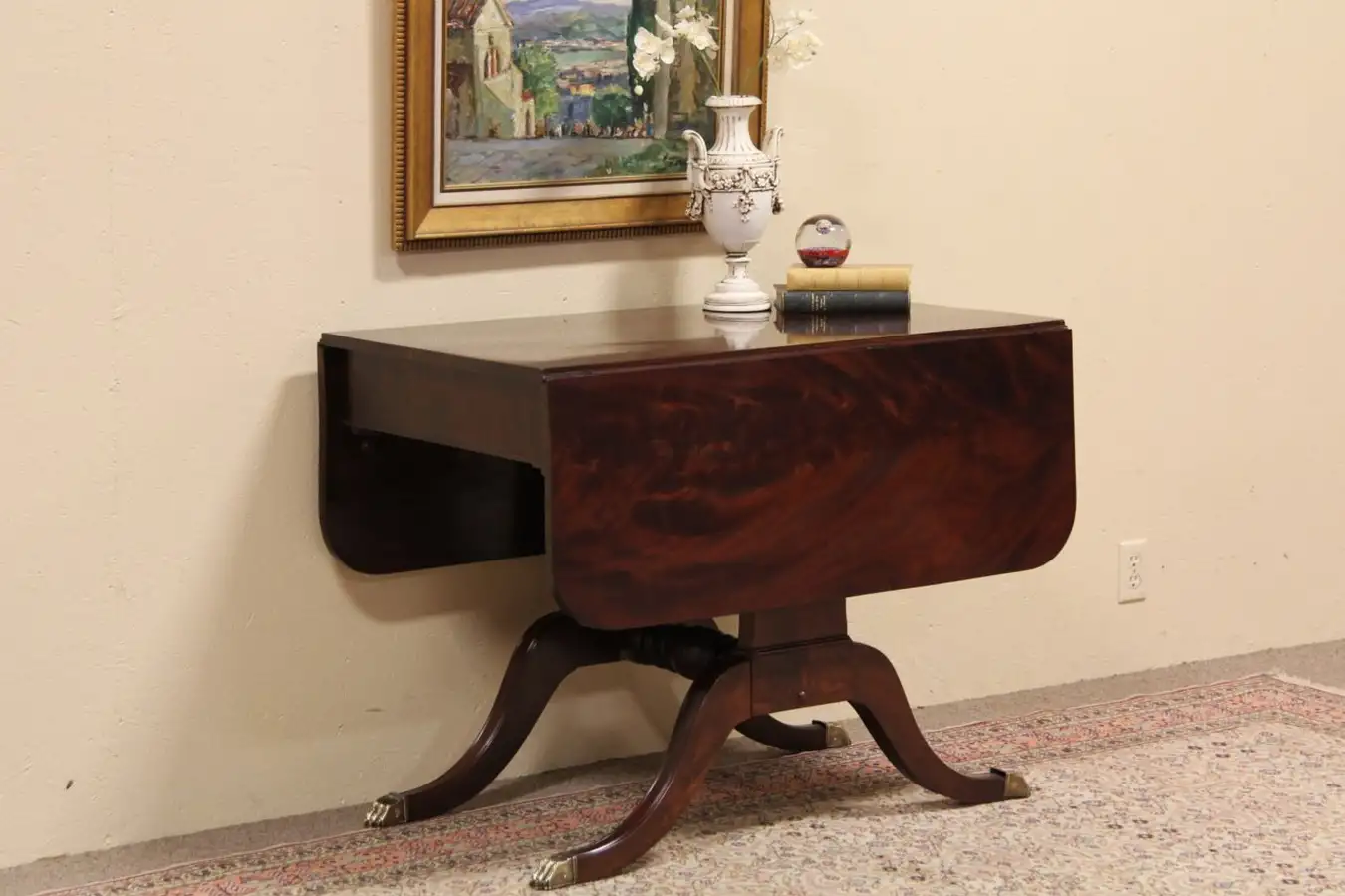 It is a wonderful dining table, but is also useful as a breakfast, tea or sofa table. The solid mahogany top and leaves are single wide planks of gorgeous figured flame grain mahogany with a superb polished finish and a few mars, see photos.