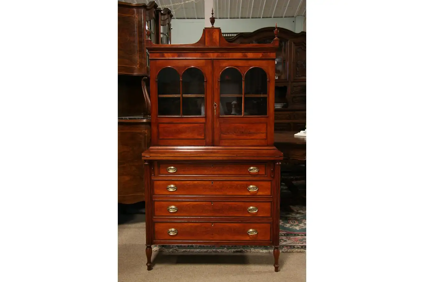 Behind the glass doors, a shelf is adjustable by sliding into different slots, below are cubbyholes. The bookcase lifts off for transport. The writing surface flips open onto wooden supports, and has a gold tooled leather surface. The back of the desk is old but not original. There are the usual shrinkage cracks from age, and this piece is very solid and sturdy. This is a wonderful sophisticated Sheraton style piece in really fine condition, and is very usable. Size is 37" wide, 20" deep and 70" tall, the writing surface is 31" above the floor.