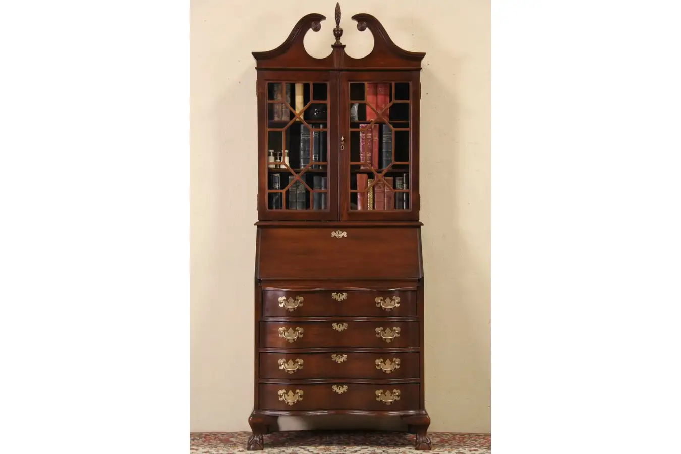 This Georgian Chippendale design secretary desk and bookcase from the 1940's is signed "Jasper," and has refined lines and exceptional workmanship. The top has a well proportioned pediment and finial. Four feet are carved ball and claw design, drawer fronts have serpentine or "ox bow" curves. Supports automatically extend under the drop front when opened, inside are "secret" drawers and cubicles.