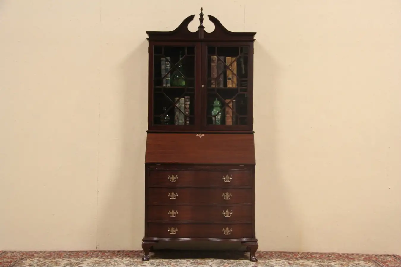 This Georgian Chippendale design secretary desk and bookcase from the 1940's has refined lines and exceptional workmanship. The top has a well proportioned pediment and finial. Four feet are carved ball and claw design, drawer fronts have serpentine or "ox bow" curves. Supports automatically extend under the drop front when opened, inside are "secret" drawers and cubicles.