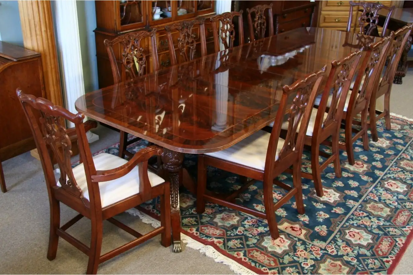 This set is very new, used only for display and never served a dinner. The table top is a full inch thick and measures 6'2" long when closed, 46" wide, 30" tall, the three 20" leaves extend the table to 11' 2" long, and there is 26" of legroom.