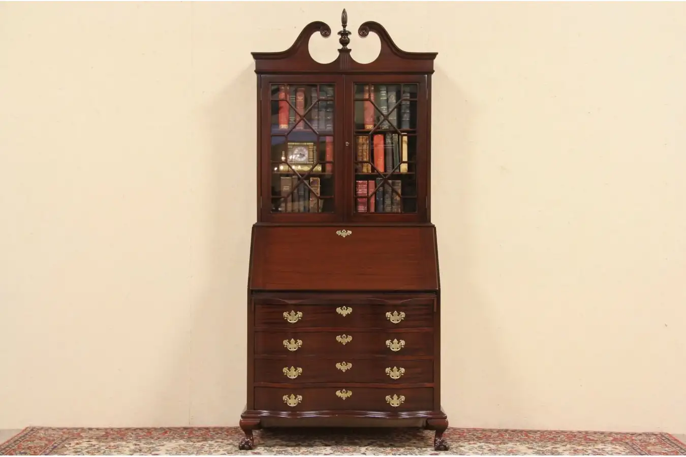 Signed by noted maker of American traditional furniture, "Maddox of Jamestown, NY" the top has a well proportioned pediment and flame shaped finial. Four feet have carved ball and claw design, drawer fronts have serpentine or "ox bow" curves. Supports automatically extend under the drop front when opened, inside are "secret" drawers and cubicles.