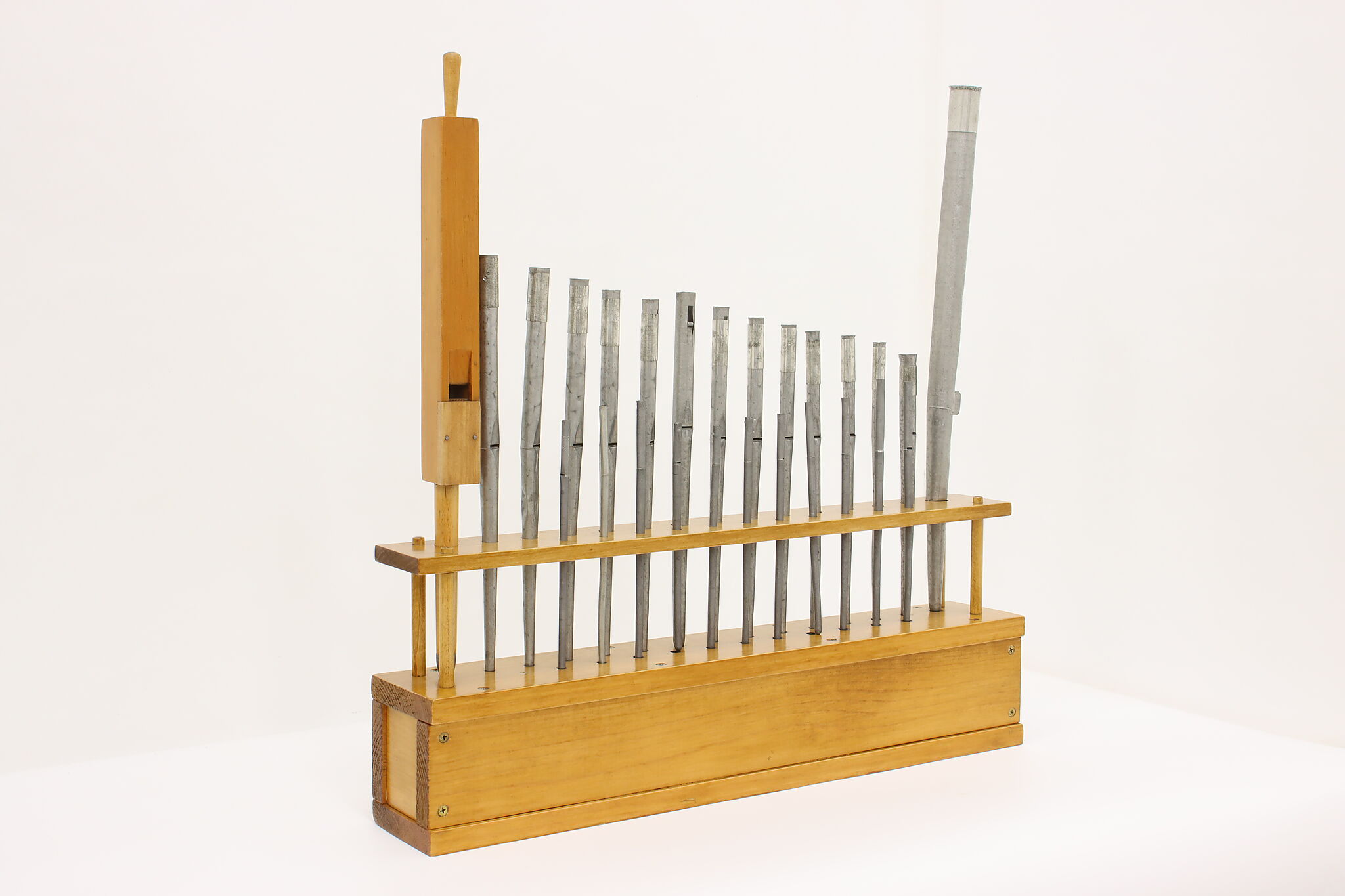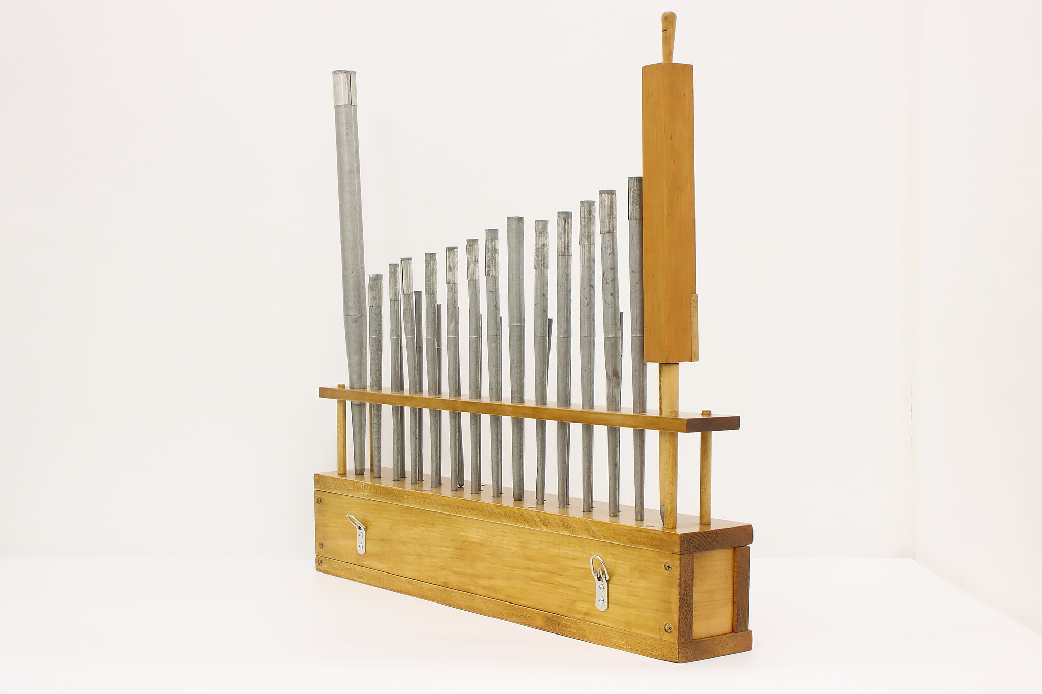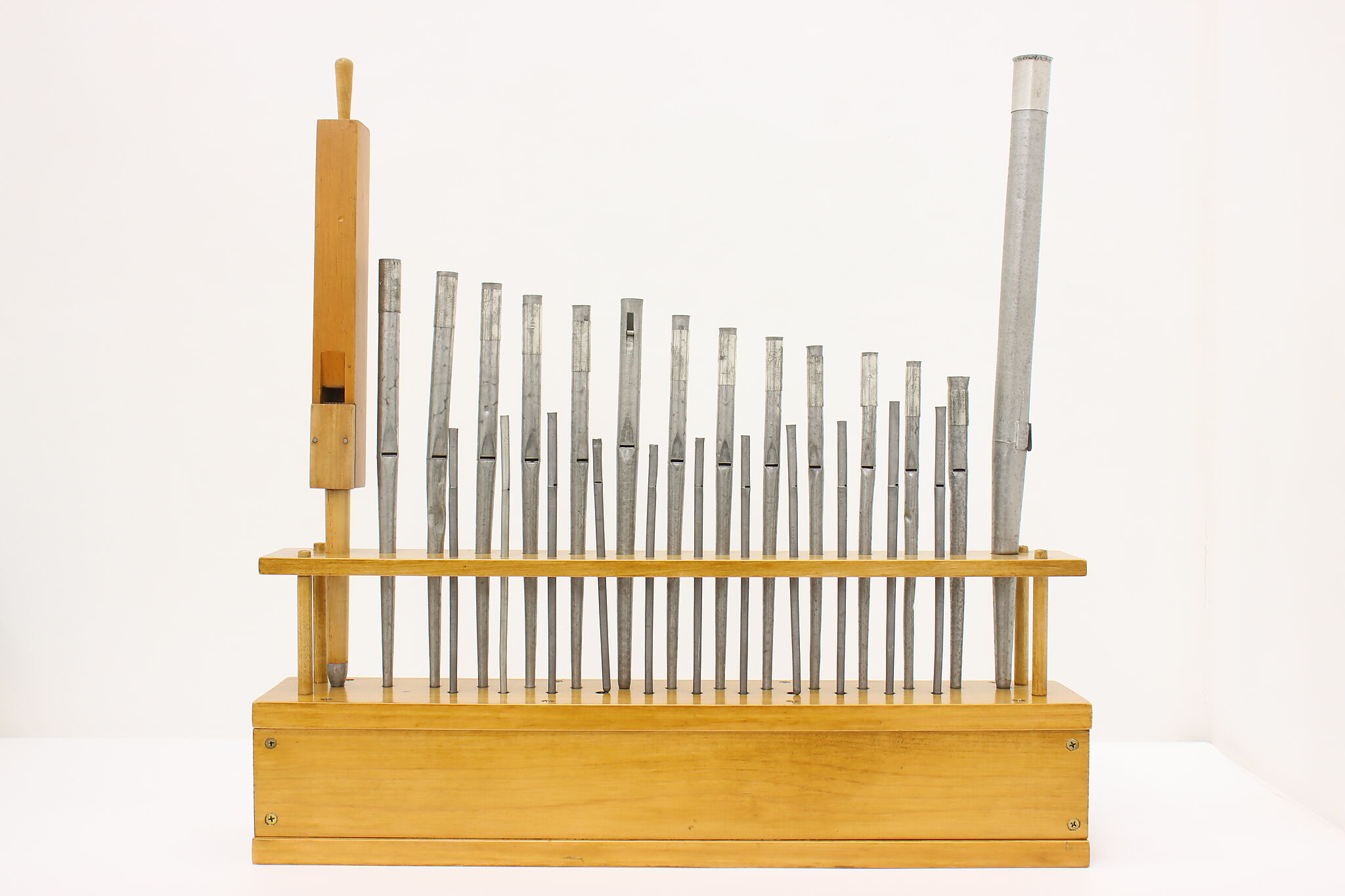 This hand crafted set of miniature "portative" or portable organ pipes was probably once attached to an air pump and keyboard, now missing.