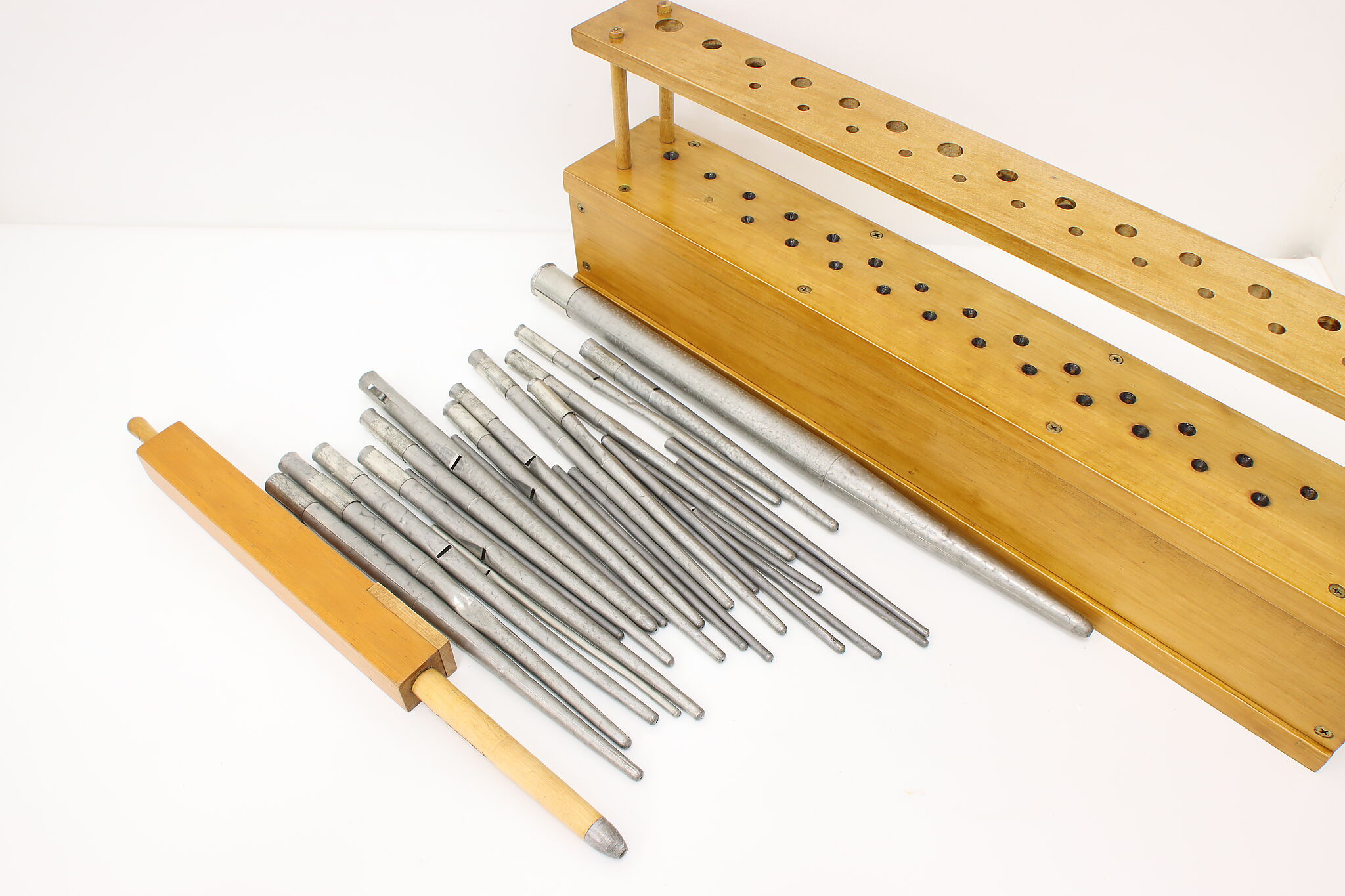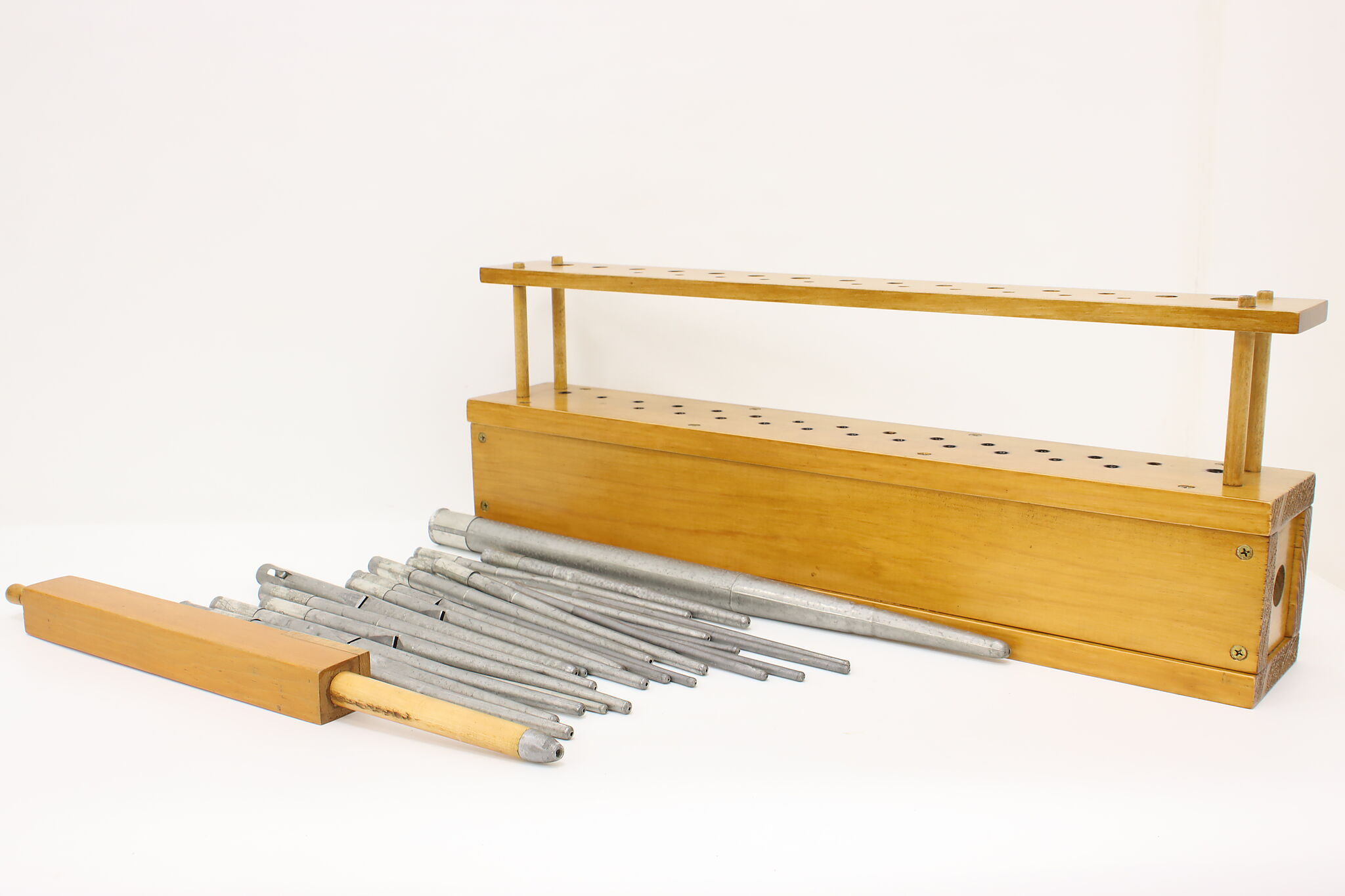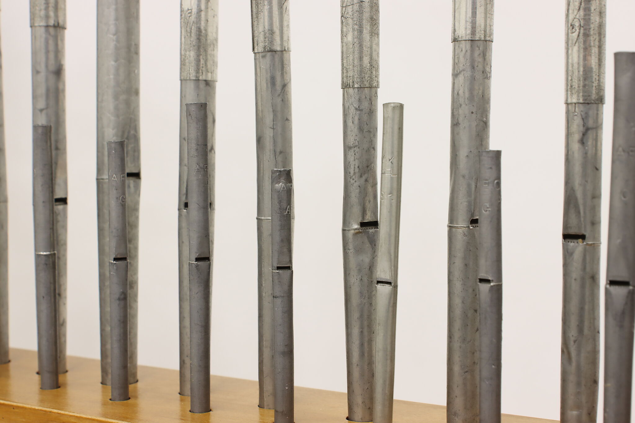 This hand crafted set of miniature "portative" or portable organ pipes was probably once attached to an air pump and keyboard, now missing.