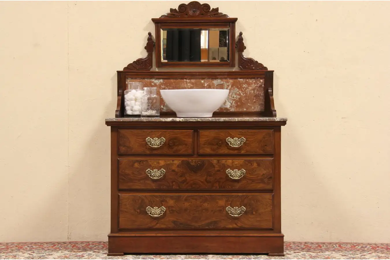 Brasses are original on drawers with hand cut dovetail joints. The richly grained marble top and backsplash have been polished and sealed to resist stains, there is a chip on the right back edges, see photos. A swivel mirror with hand carved frame has original beveled plate glass.
