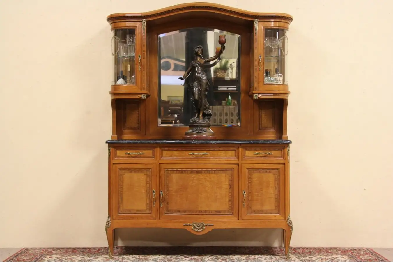 A spectacular 1910 era back bar, sideboard or server with display cabinets and mirror has a marble top. This exquisite furniture shows superior craftsmanship from the golden age of Buenos Aires in Argentina - see photos of the expert finesse throughout.