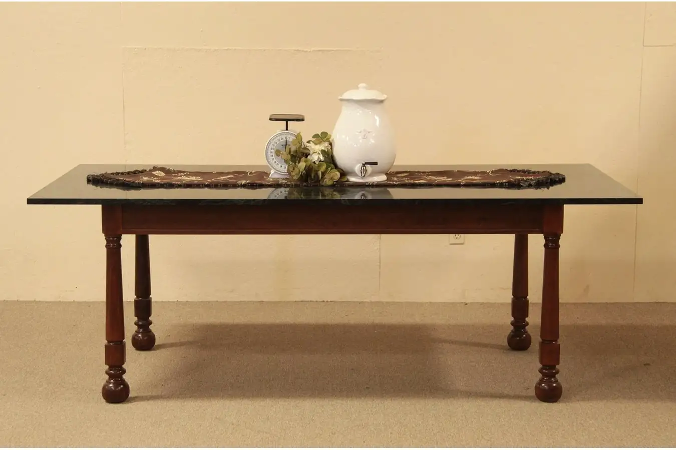 Used in a candy store, this green marble-topped table would make a wonderful kitchen work island or dining table. The walnut base is rugged and strong with cannonball feet, and the finish is excellent.