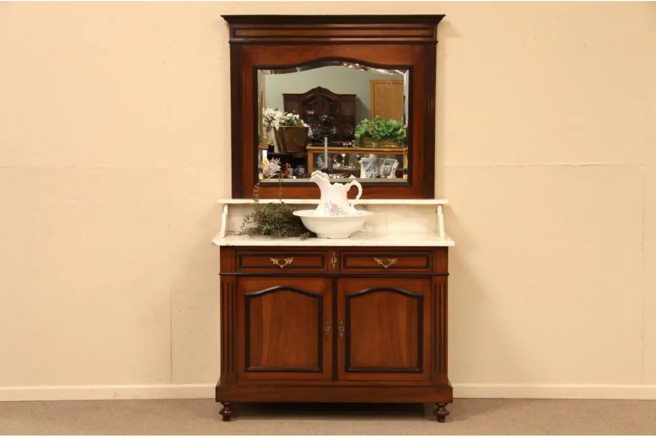 This Victorian furniture with marble top and beveled mirror was intended to hold a bowl and pitcher set in a bedroom during the days before plumbing - today it might be a server, bar or vessel sink vanity.