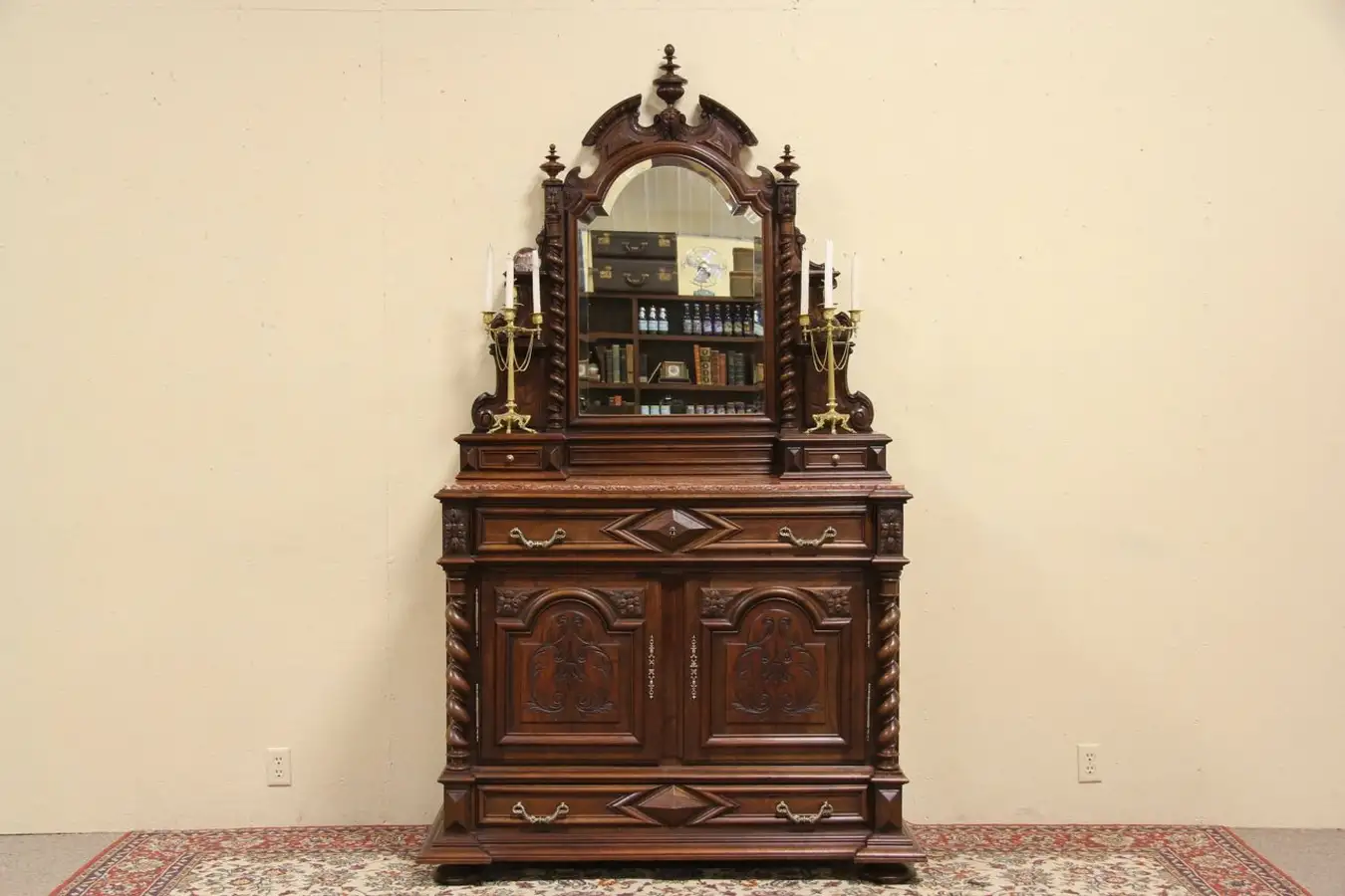 There is just a little "smoke" in the mirror to show its age. The upper gallery, shelves and mirror are removable for easier shipping.