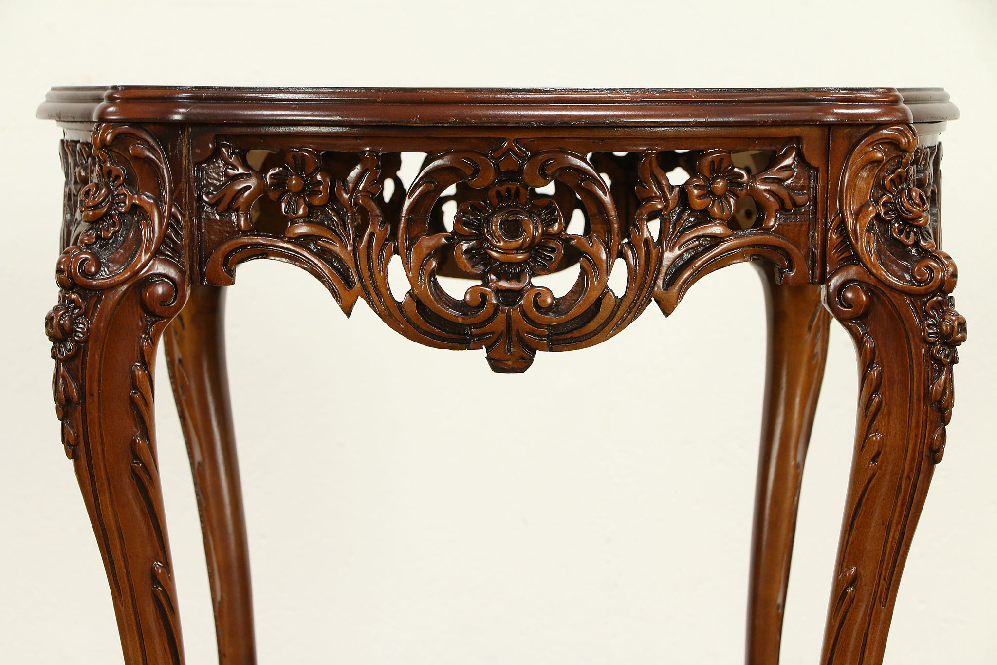 A richly carved and pierced hall center or lamp table from the 1940's is walnut with a matched grain top inlaid with satinwood marquetry in the French manner.