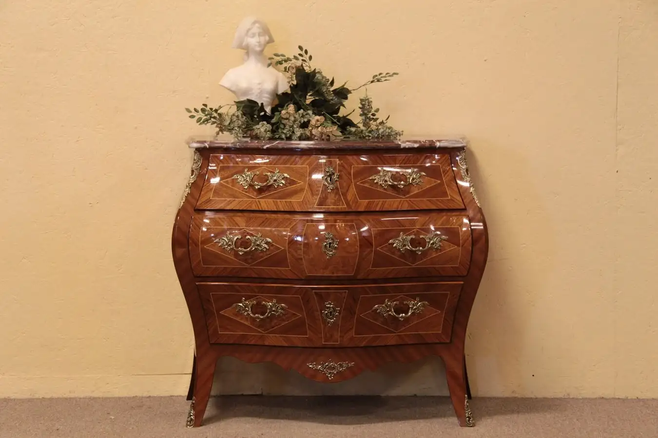 The gracefully curved bombe or convex sides and front have artistically inlaid marquetry of rosewood, burl, mahogany and satinwood. Lavish heavy brass mounts are original.
