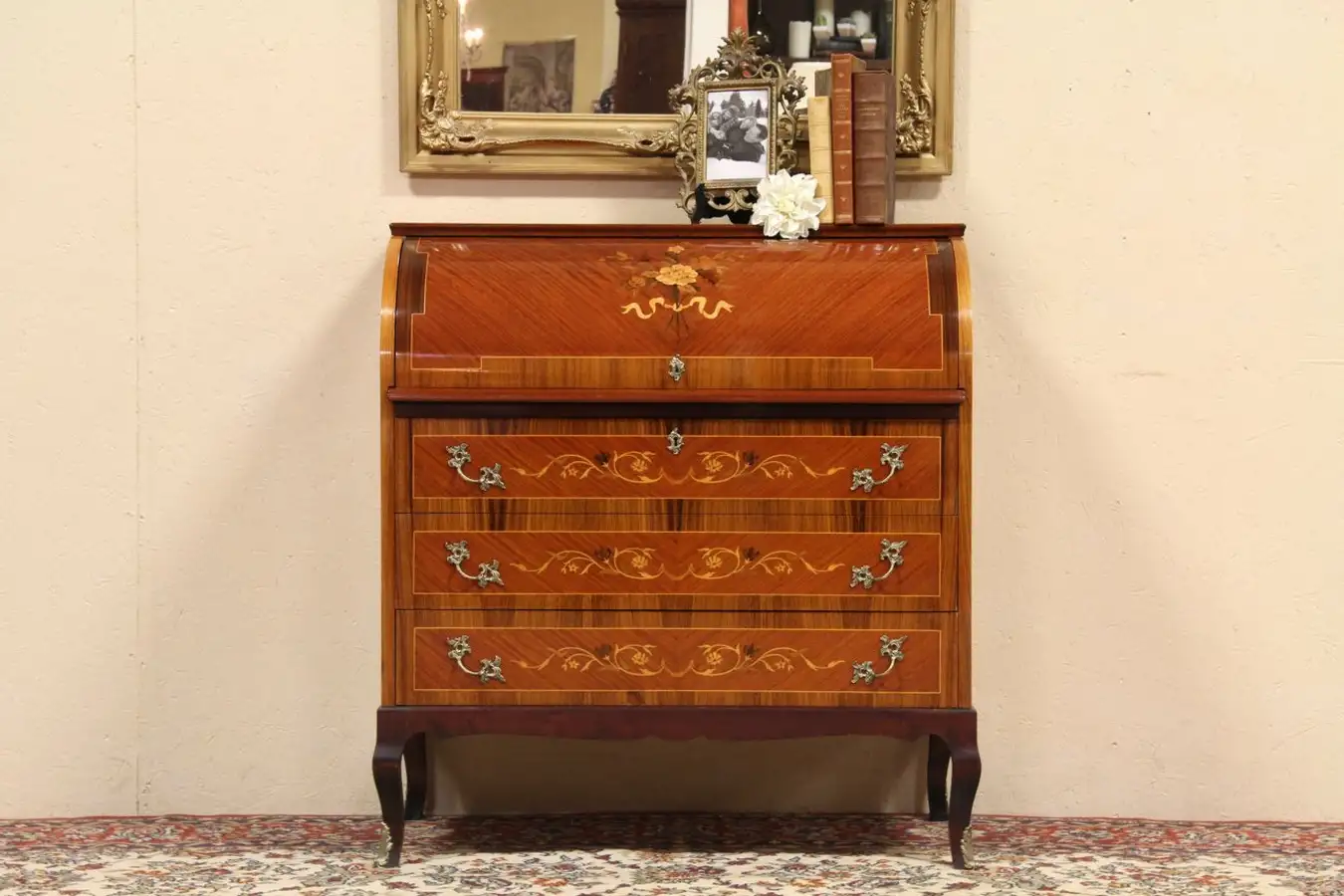 This exquisite 1950's marquetry desk with a cylinder or barrel roll top has diagonally matched mahogany inset with satinwood, tulipwood, ebony and rosewood. Inlaid banding surrounds the finely detailed designs. There are minor mars and very little wear to the original polished finish, which is in excellent condition. The writing surface has two dimples plus a small shrinkage separation at the edge, see photos