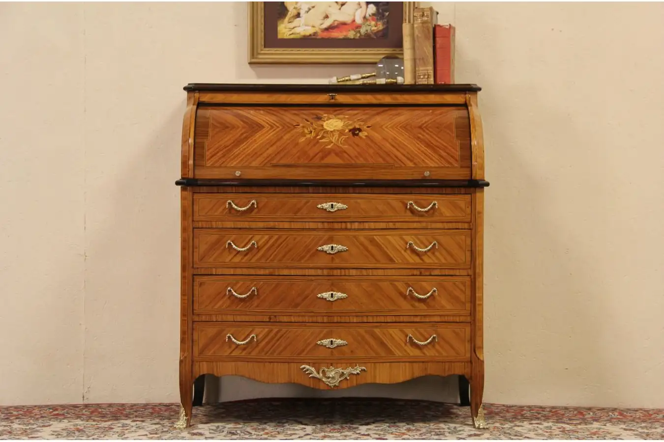 This exquisite 1950's marquetry desk with a cylinder or barrel roll top has diagonally matched mahogany inset with satinwood, tulipwood, ebony and rosewood. Two secret drawers are opened by hidden push buttons. Inlaid banding surrounds the finely detailed designs. There are minor mars and very little wear to the original polished finish, which is in excellent condition.