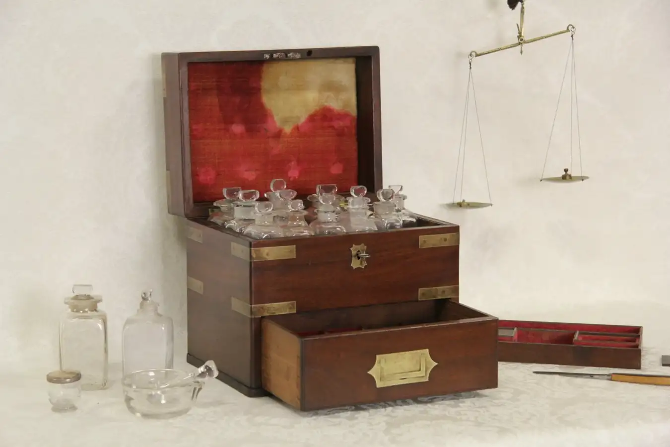 Wonderfully hand made in England for a physician about 1870, this traveling apothecary medicine or drug chest is from the days of house calls. Inside are blown glass bottles with fitted stoppers, some have residue from drugs and some have chips. The lower drawer has tiny hand cut dovetail joints and a fitted tray for a folding pharmaceutical scale and weights. Below are a mortar and pestle and more medicine jars.